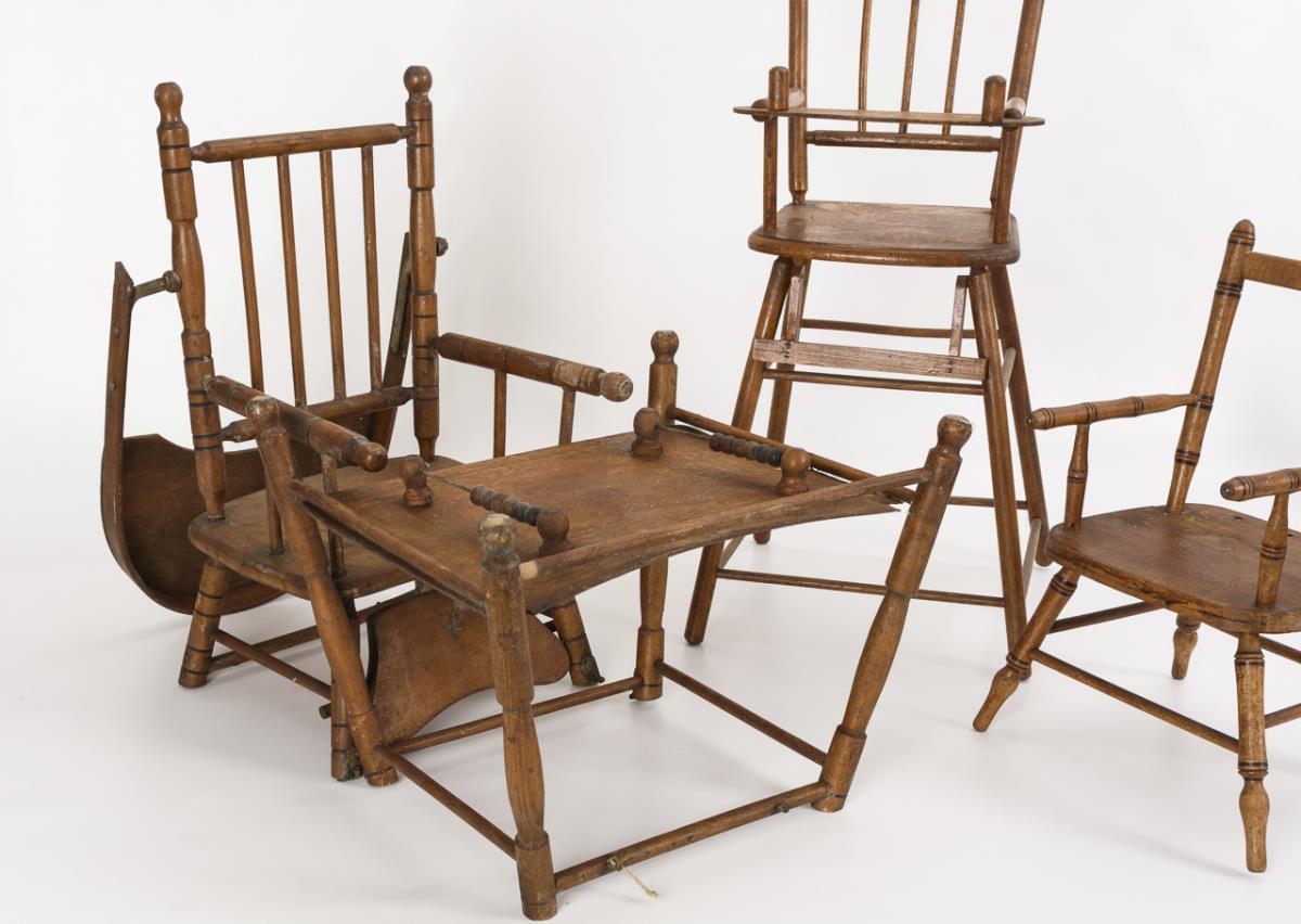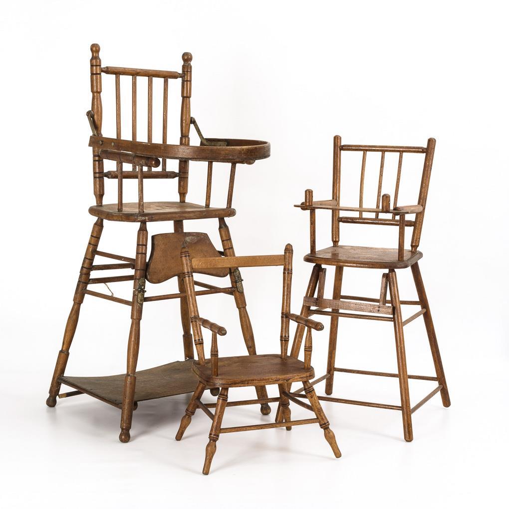 2 Hochstühlchen und 1 kleiner Stuhl. Altersspuren und Defekte, 1x Scharniere defekt.