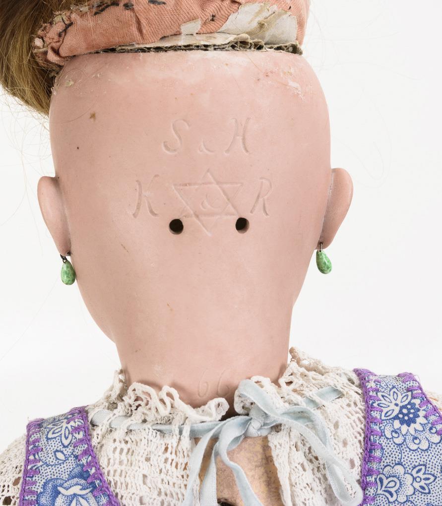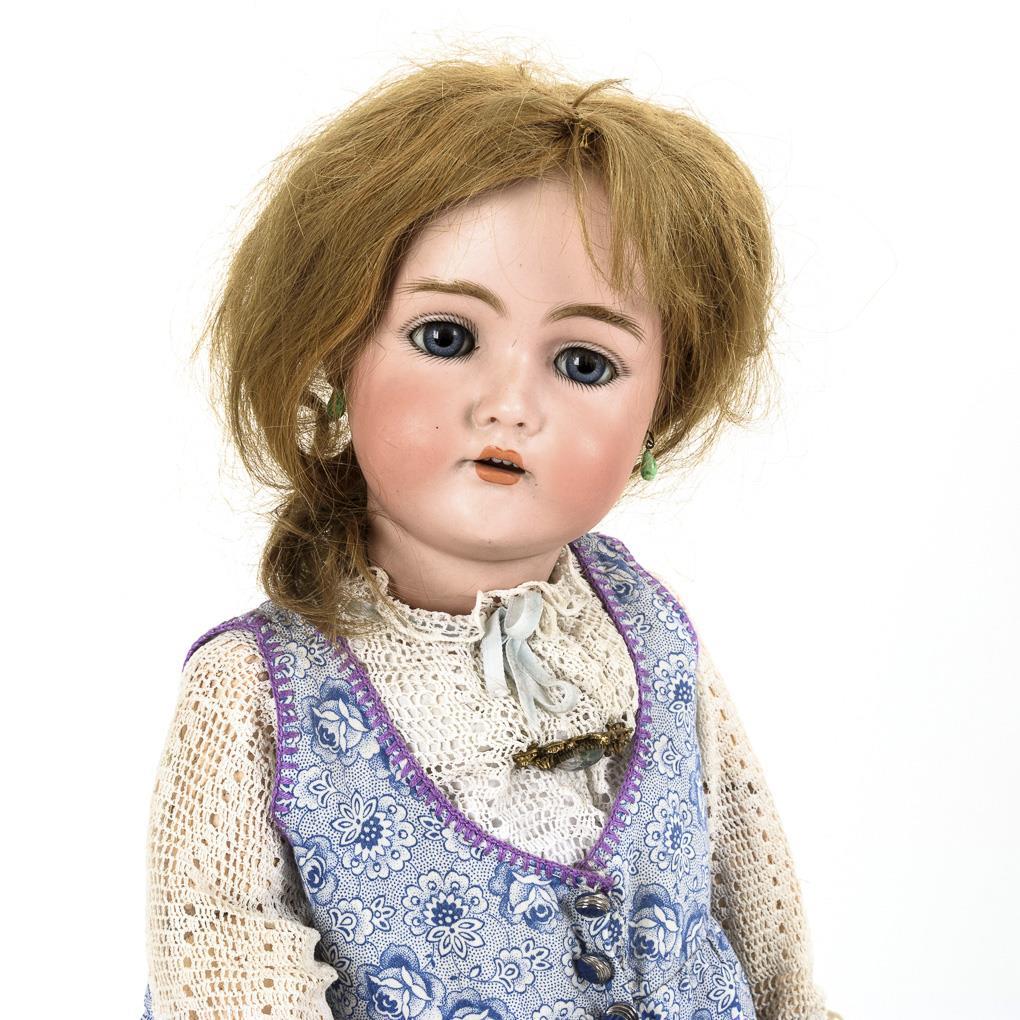 Kurbelkopf, blaue Schlafaugen, Wimpern, Ohrringe, mittelblonde Echthaarperücke. 17-teiliger Gliederkörper mit 2-geteiltem Torso und verstummter Zugstimme. Blau gemustertes Kleid, weiße Unterwäsche, braun-karierte Pantoffeln. Kopf nicht durchleuchtet, da provisorischer Kopfdeckel fest. Minimaler Perückenpull, 1 Chip an der Stirn, Perücke repariert. Körper mit Farbretuschen.