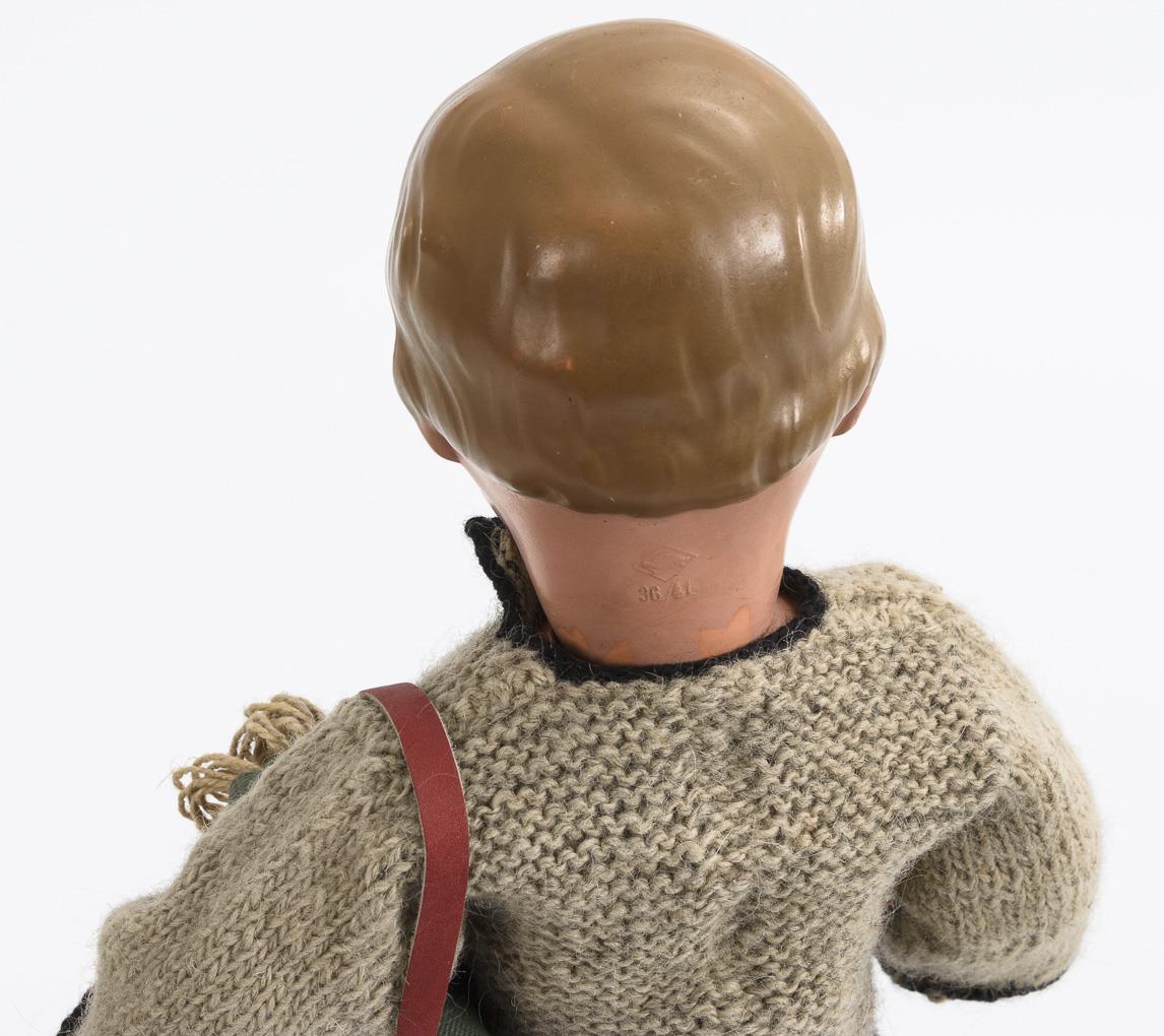 Celluloid-Puppe als bayrischer Bub: Kurbelkopf, feste blaue Augen, modellierte braune Haare. 5-teiliger Stehpuppenkörper. Graue Strickjacke, graue Filzhose, grüner Tirolerhut mit zahlreichen Wanderabzeichen. Dazu Rucksack und defekte Blechgeige. Kleine Retuschen am Kopf.