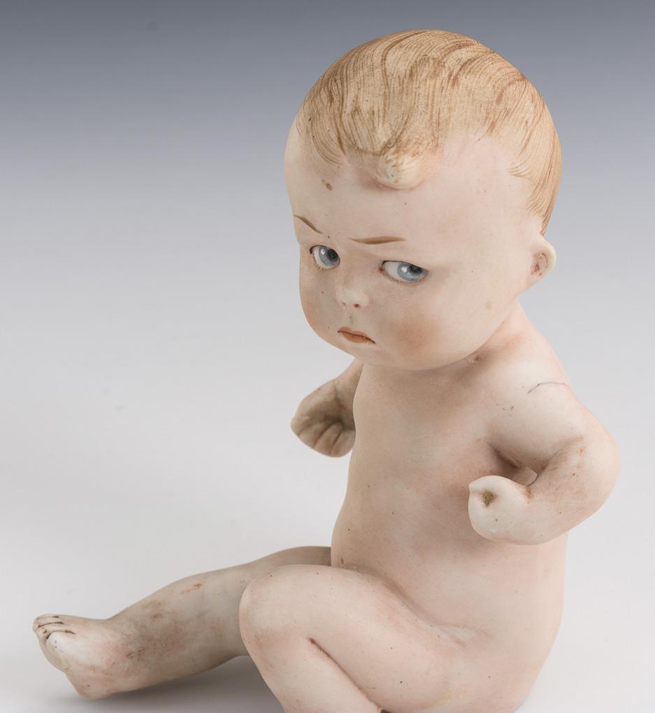 3 nackte Babys in verschiedenen Positionen. 1x mit anmodellierten Schuhen und Strümpfen. 1x mit minimalem Brandriss, 1x minimaler Haarriss am Po, 1x unterseitig minimal bestoßen.