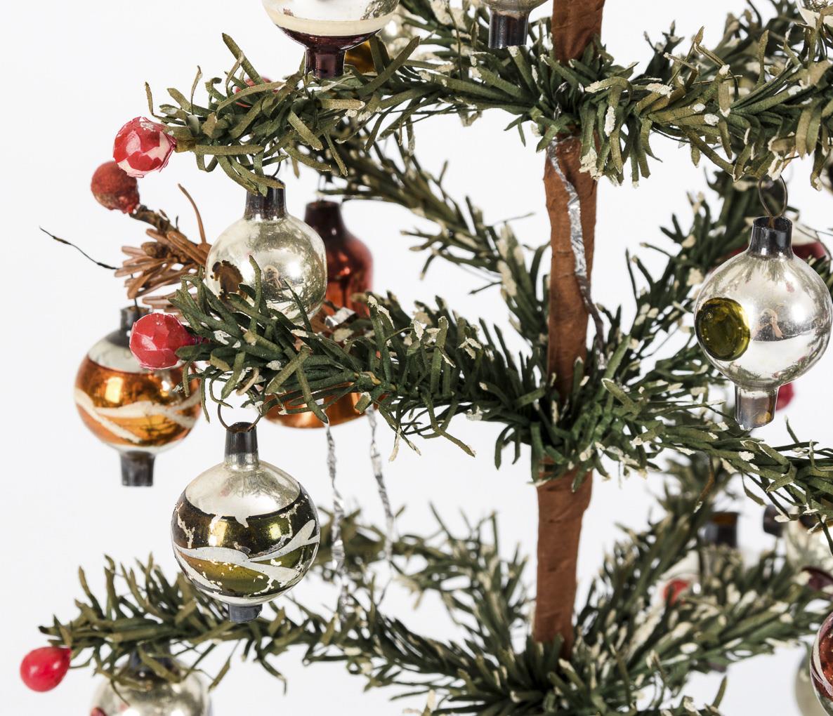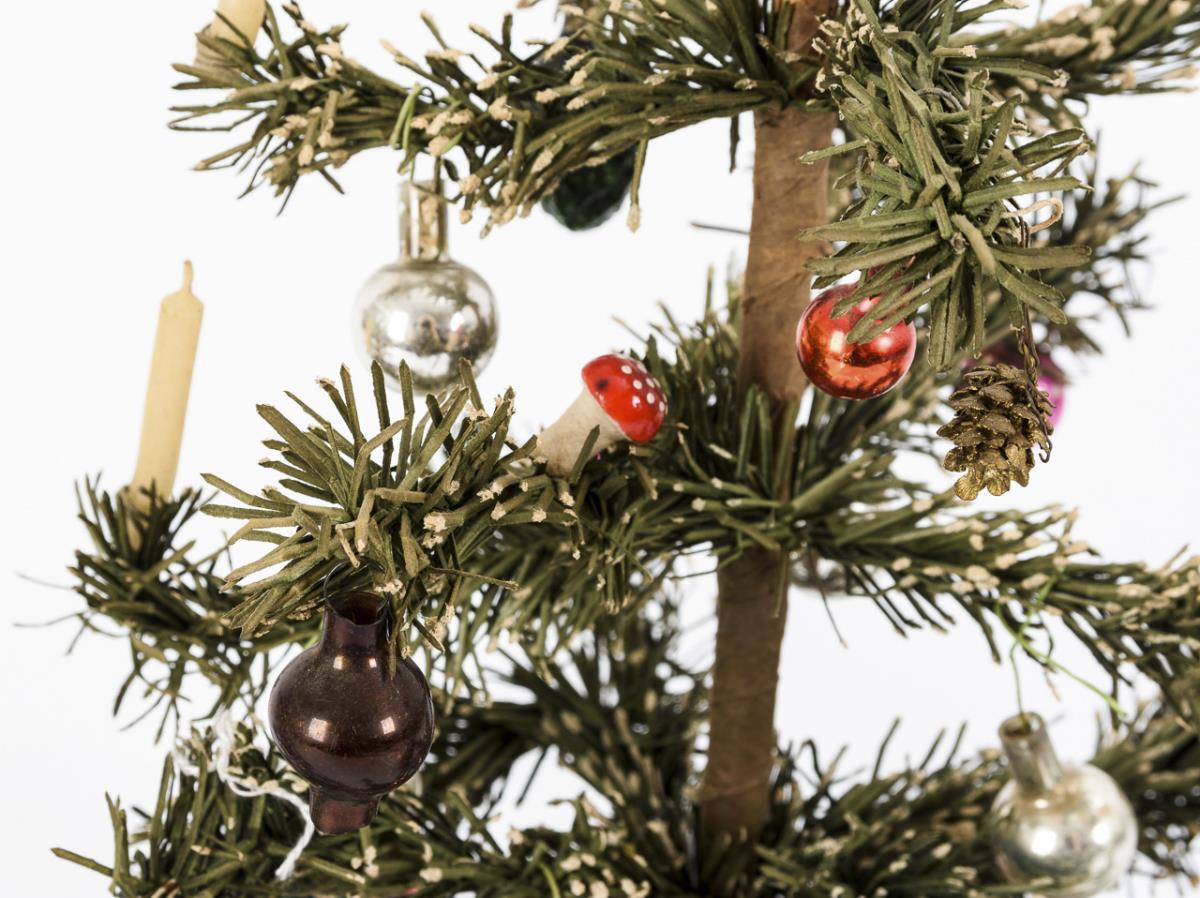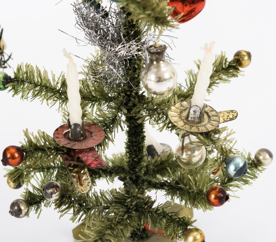 2 kleine und 1 größeres, reich geschmücktes Christbäumchen. Altersspuren, kleine Defekte, 2 Spitzen fehlend.
