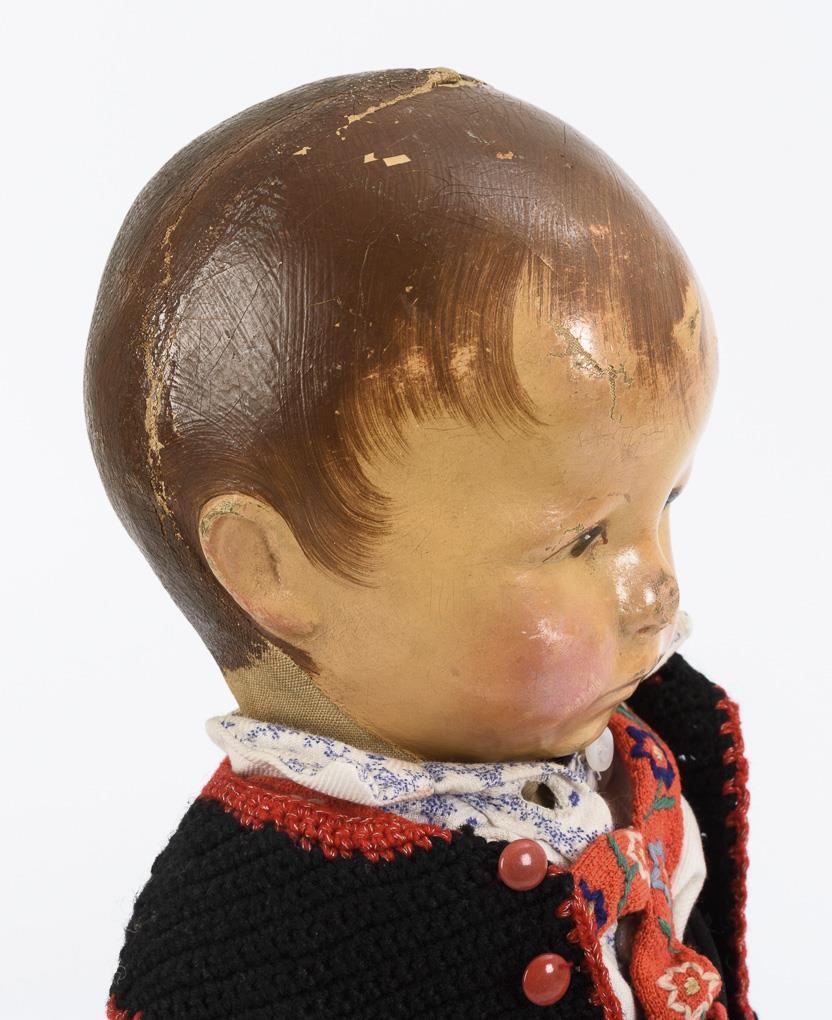 Maskenartig bemalter Kopf mit 3 Hinterkopfnähten, braune Augen, gemalte Haare. Stoffkörper mit Schlenkergliedern und Knopf am Rücken (Bändchen fehlt). Schwarze Kleidung im Trachtenstil, 1 geringelter Strumpf. Kopf mit Retuschen und Farbdefekten, Spielspuren am Körper, mit kleinen Defekten.