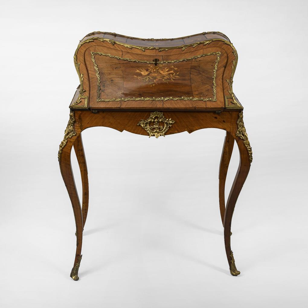 Zierlicher Schreibtisch mit Schreibklappe, in stiltypisch geschwungener Form, dekoriert mit üppigen Messing-Applikationen, Vogel- und Blumenmarketerien sowie ebonisierter Bandintarsie; innen 4 kleine Schübe und 1 offenes Fach. Alters-/Gebrauchsspuren, restauriert.