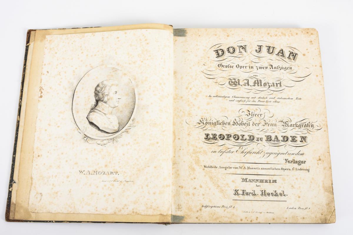 "Lenore" und "Des Pfarrers Tochter von Taubenhayn" von G.A. Bürger in Musik gesezt (sic) von I.B. Zumsteeg. Titel mit Kupferstichen. 34 und 21 Seiten mit gestochenen Noten. 24 x 33 cm. / "La Flûte enchantée de Mozart" und "Le Chalet, d'Ad. Adam". 54 und 60 Notenseiten, Schonenberger, Paris. 34 x 27 cm. / "Mozart: "Don Juan" große Oper in zwey Aufzügen, 217 Seiten, teils stockfleckig. / Mozart: "Zauberflöte", große Oper in zwei Aufzügen. Für die beiden letzten Werke: In vollständigem Clavierauszug mit deutsch- und italienischem Texte und zugleich für das Pianoforte allein. Mannheim bei K.F. Heckel. Noten im Kupferdruck, Alters- und Gebrauchsspuren.