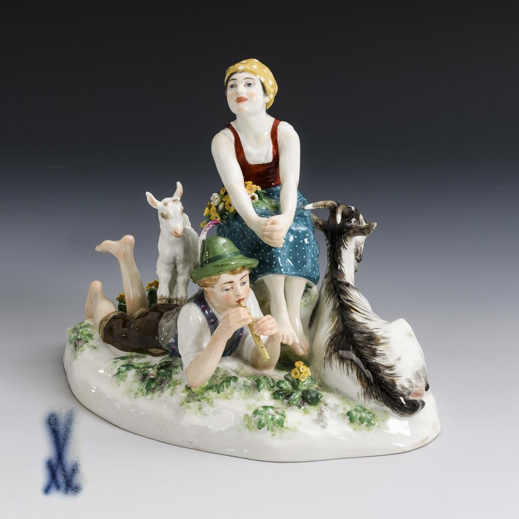 Kinderpaar als Ziegenhirten mit Ziege und Zicklein. Sockel unterseitig und verso sowie 1 Ziegenohr restauriert.