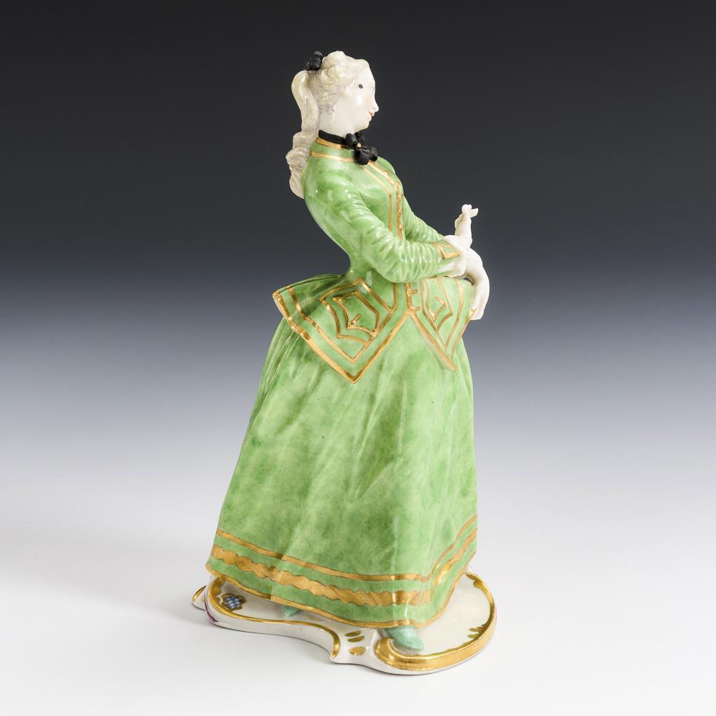 Junge Dame auf einem Rocaillesockel, die linke Hand abwehrend erhoben. Haarschleife bestoßen.