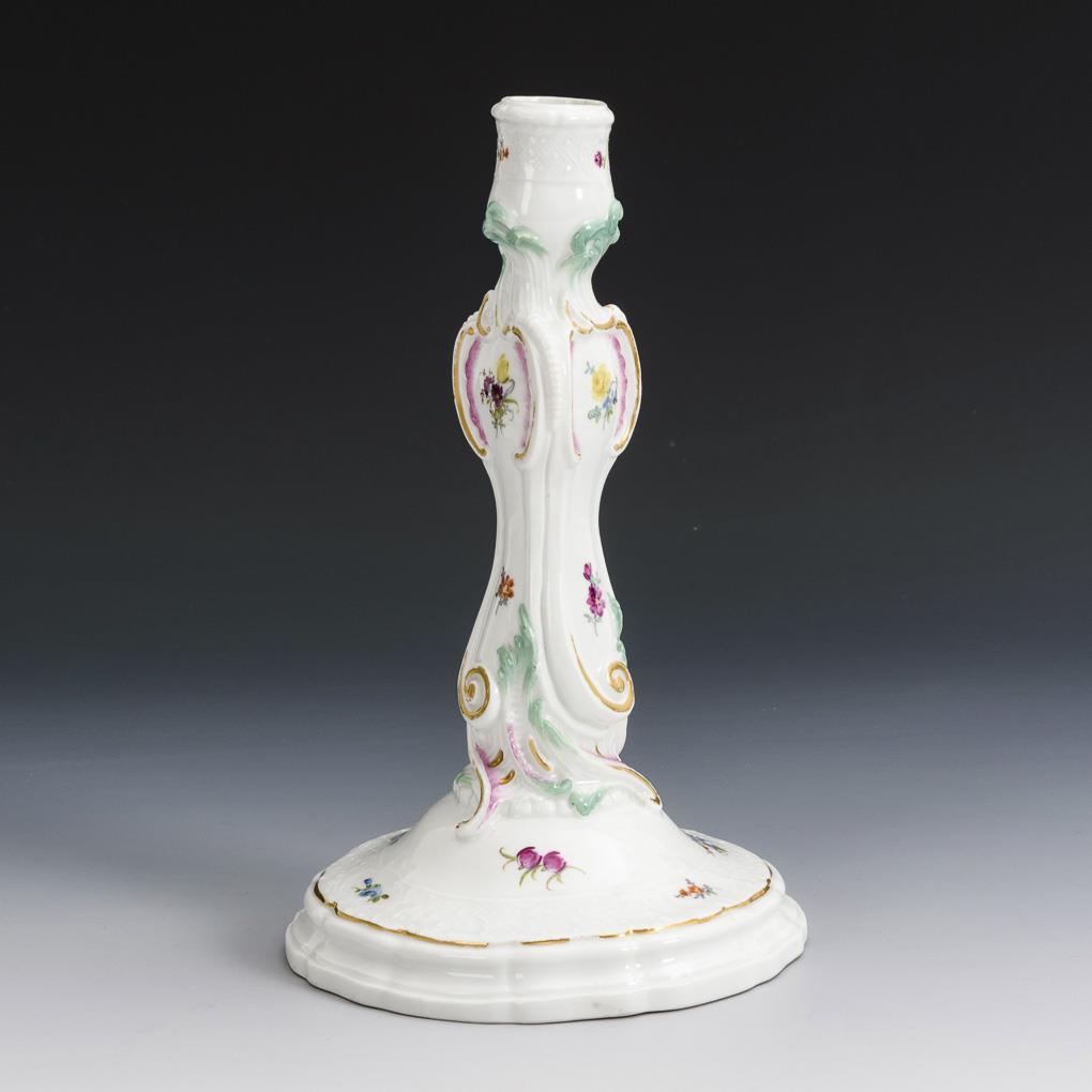 1-flammiger Leuchter mit dreiseitigem Rocailleschaft und mehrpassigem Fuß. Fuß restauriert, Brandriss am Fußrand, partieller Goldabrieb.