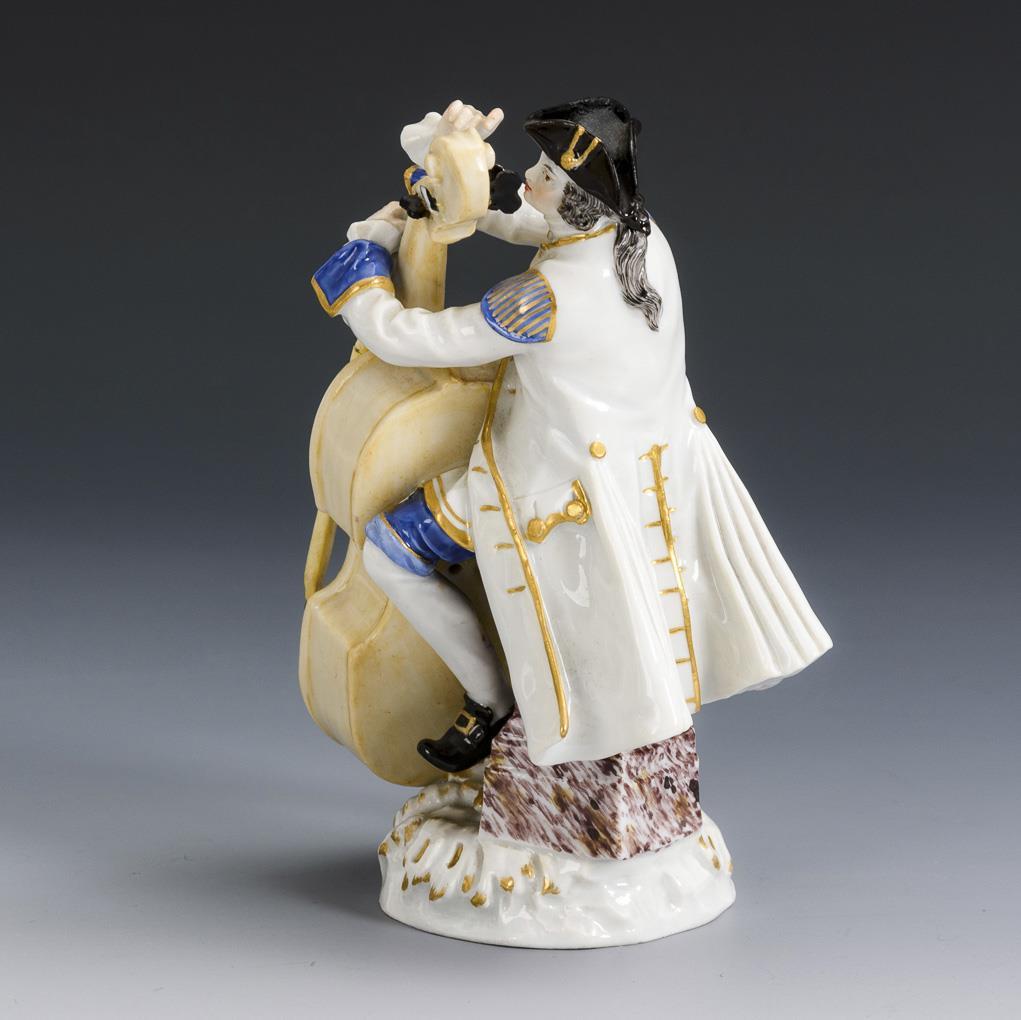 Auf einem Postament sitzender, einen Kontrabass spielender Rokokoherr. Bogen restauriert und geklebt, 1 Wirbel fehlt, 1 Wirbel bestoßen, 1 Wirbel restauriert, Restaurierung am Hutrand.