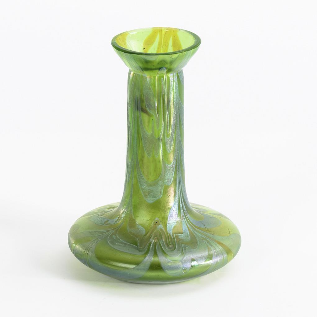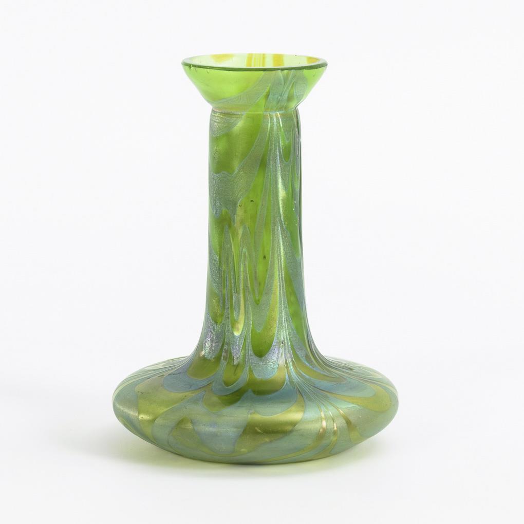 Grünes Glas mit silbergelben, aufgewalzten und wellig verzogenen Fäden, irisiert. H 13 cm.
