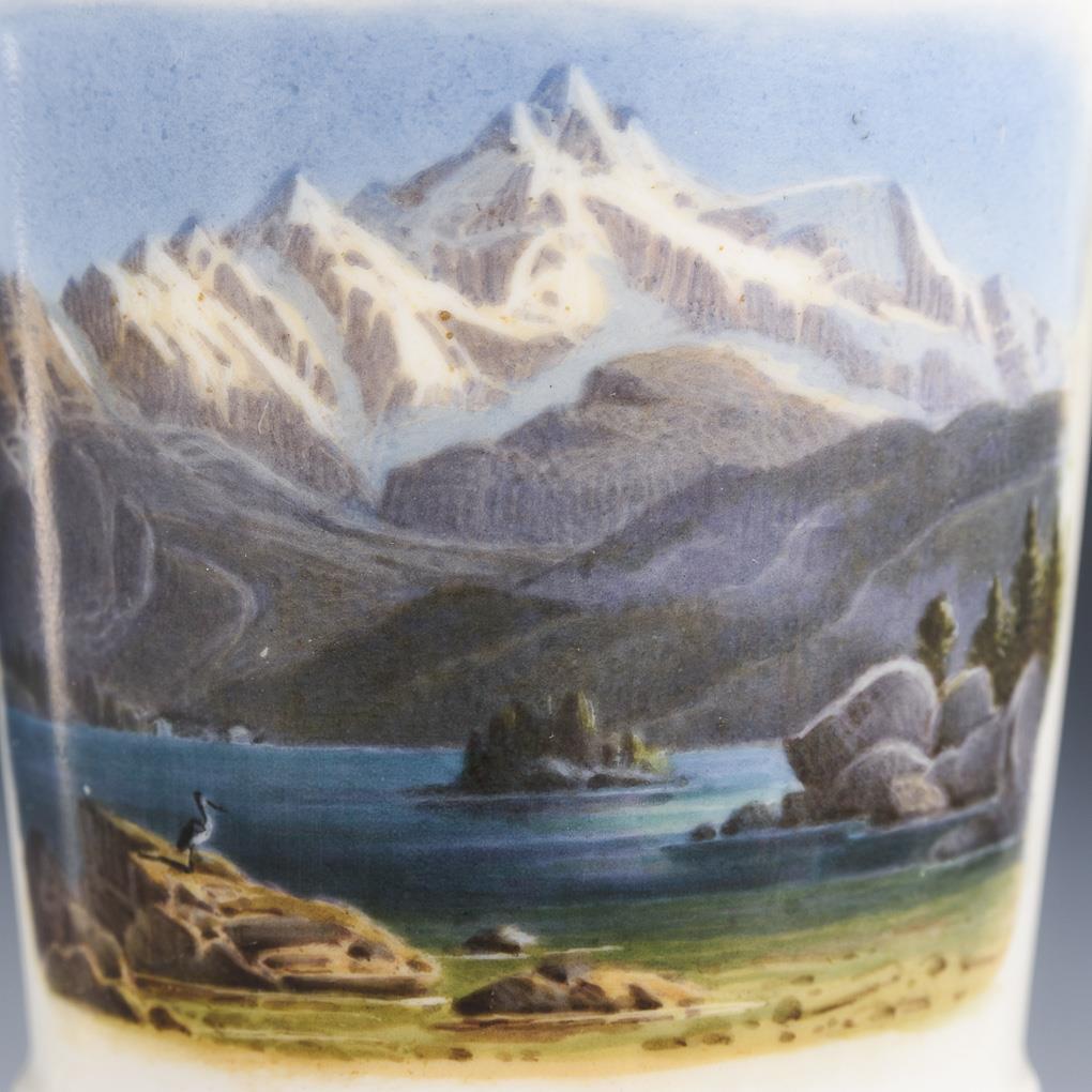 Fußbecher mit der schauseitigen Ansicht eines alpinen Sees mit Insel und Blick auf die Berge. Wandung restauriert, partieller Goldabrieb.