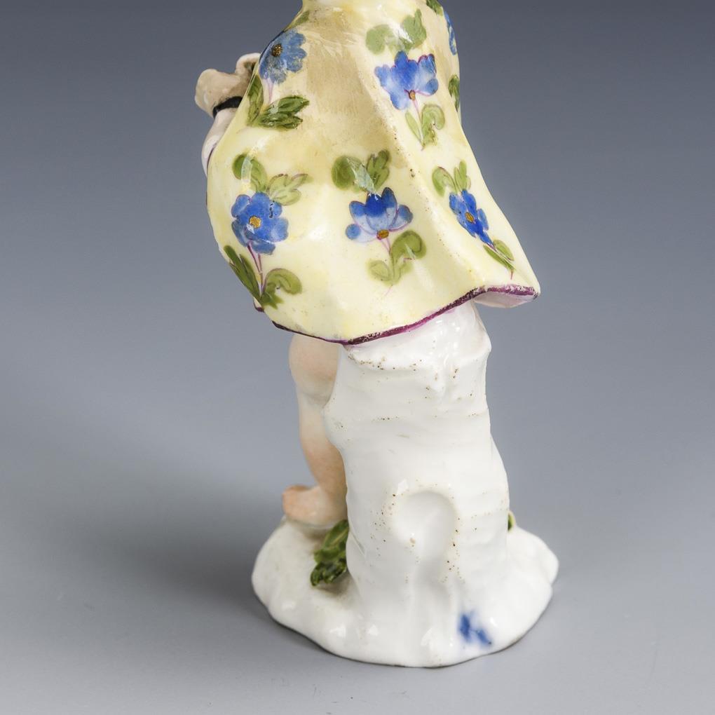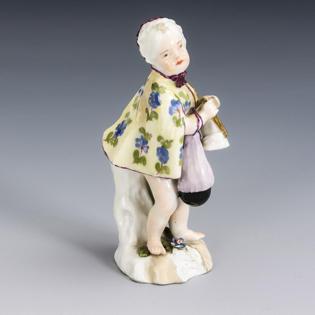 Kleine verkleidete Amorette mit Mütze, Stricknadel und Pompadour. Flügel fehlen, Sockel restauriert und bestoßen,1 Ecke des Umhangs bestoßen, linke Hand restauriert.