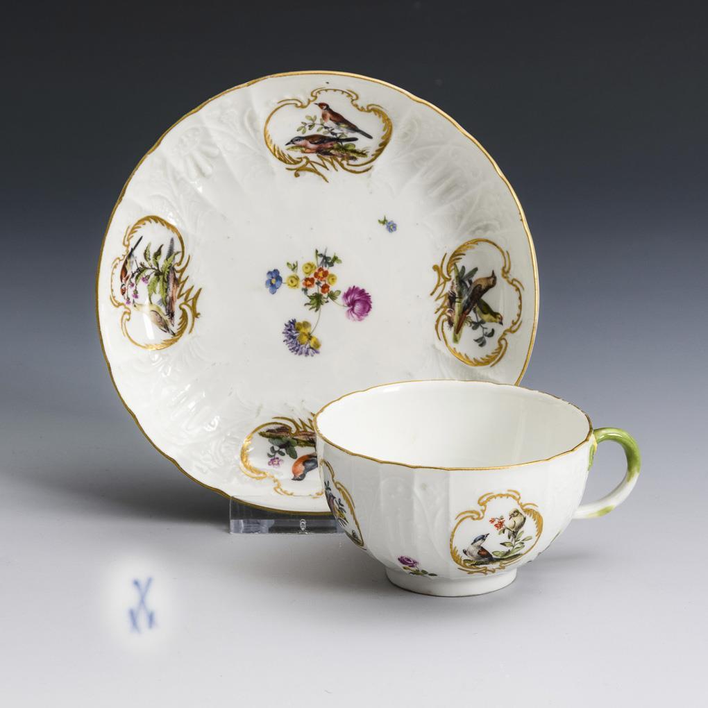Form "Dulong". Bauchige Tasse mit Asthenkel. In den goldgerahmten Rocaillekartuschen jeweils die Darstellung von verschiedenen Vögeln.