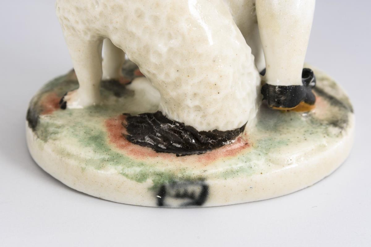 An einem Hund stehender, eine Querflöte spielender Knabe. Hut des Knaben, Querflöte und beide Beine restauriert.