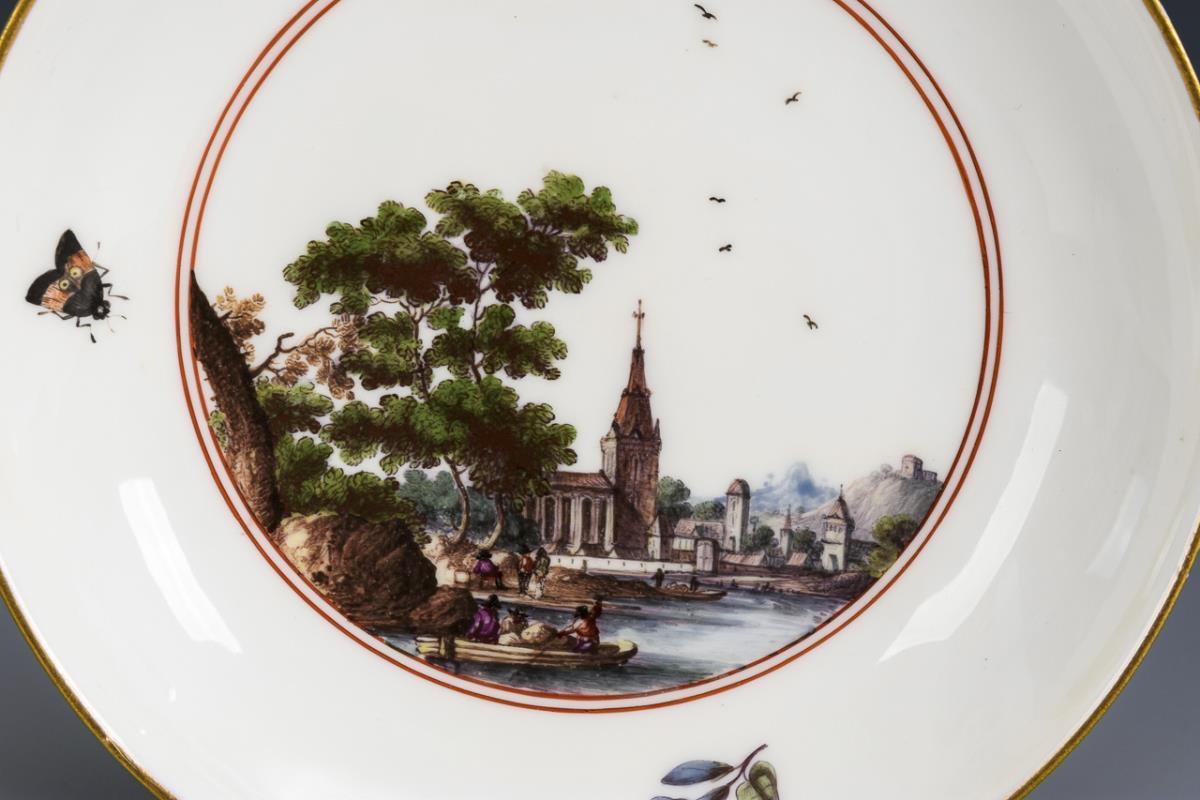 Auf Koppchen und Untertasse fein gemalte Flusslandschaften mit Architektur und Personenstaffage. Koppchen am Standring restauriert.