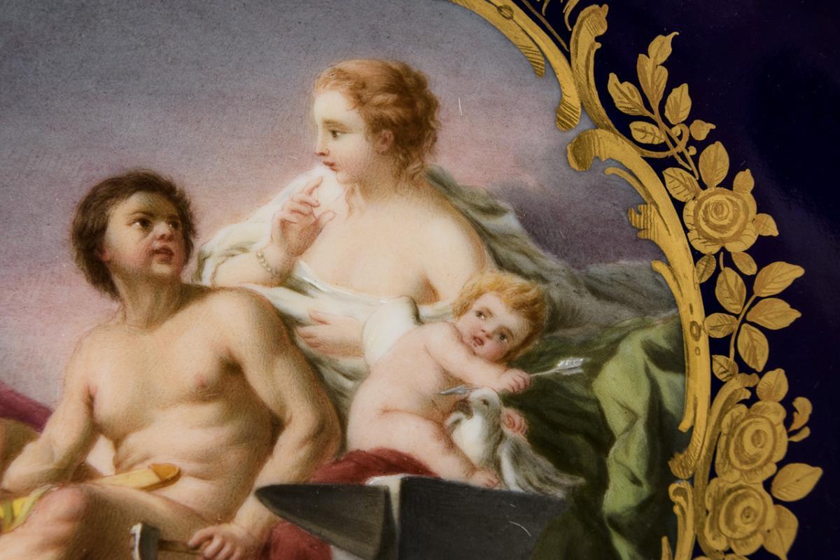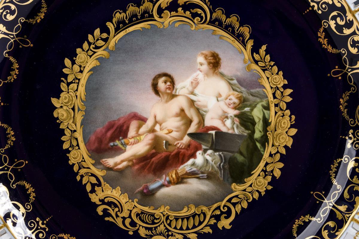 Teller mit floral- und gitterdurchbrochener Fahne. Im kobaltblauen Spiegel ein goldrocaillegerahmtes Medaillon mit der verso bezeichneten mythologischen Darstellung von Vulkan und Venus mit Amorknaben.
