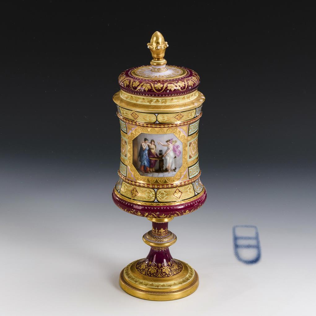Konkaver Korpus mit Knaufdeckel, nodiertem Schaft und getrepptem Rundfuß. Verschiedenfarbiger Teilfond mit feiner floral-ornamentaler Reliefgoldmalerei und Juwelenmalerei. Beidseitig eine Rechteckkartusche mit einer mythologischen Darstellung. Minimaler Goldabrieb am Knauf.