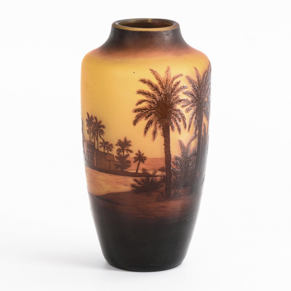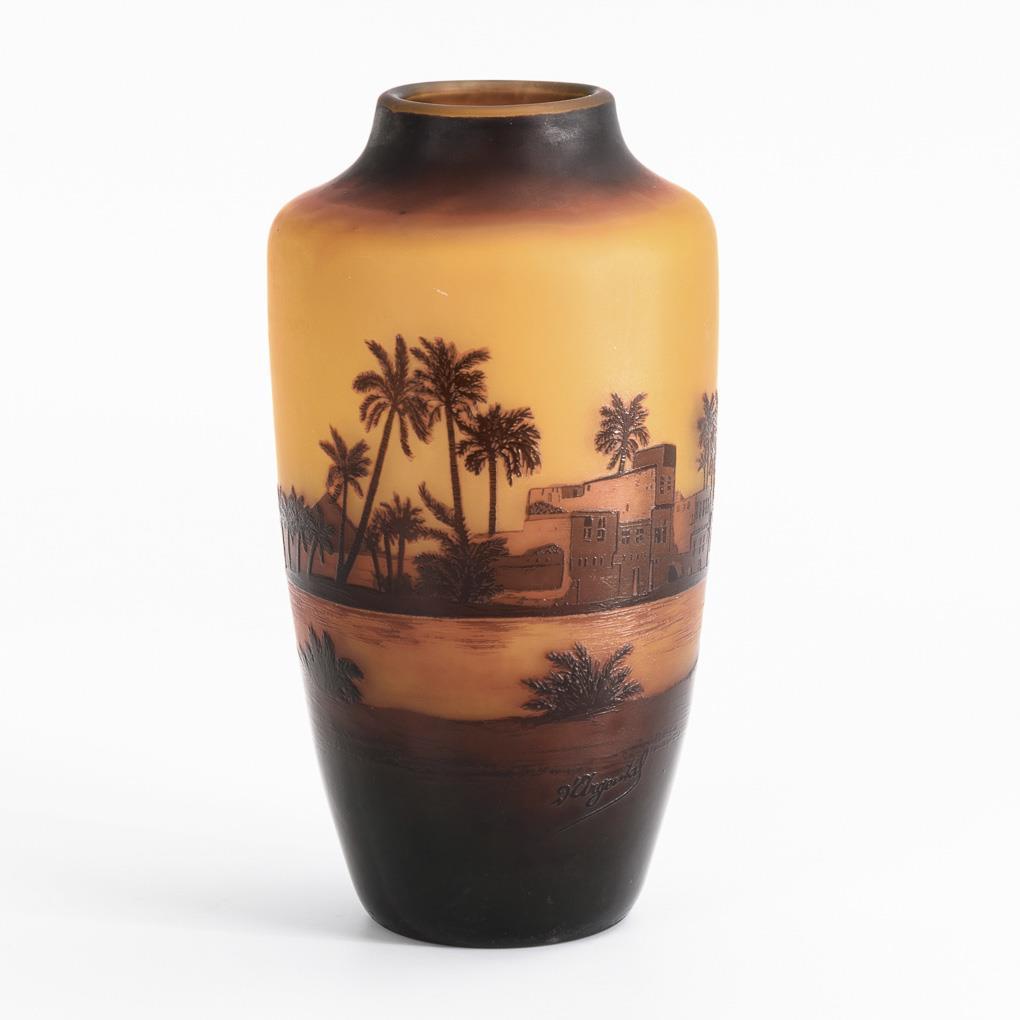 Balustervase mit der umlaufend geätzten Darstellung einer ägyptischen Nillandschaft mit Blick auf die Pyramiden von Gizeh.