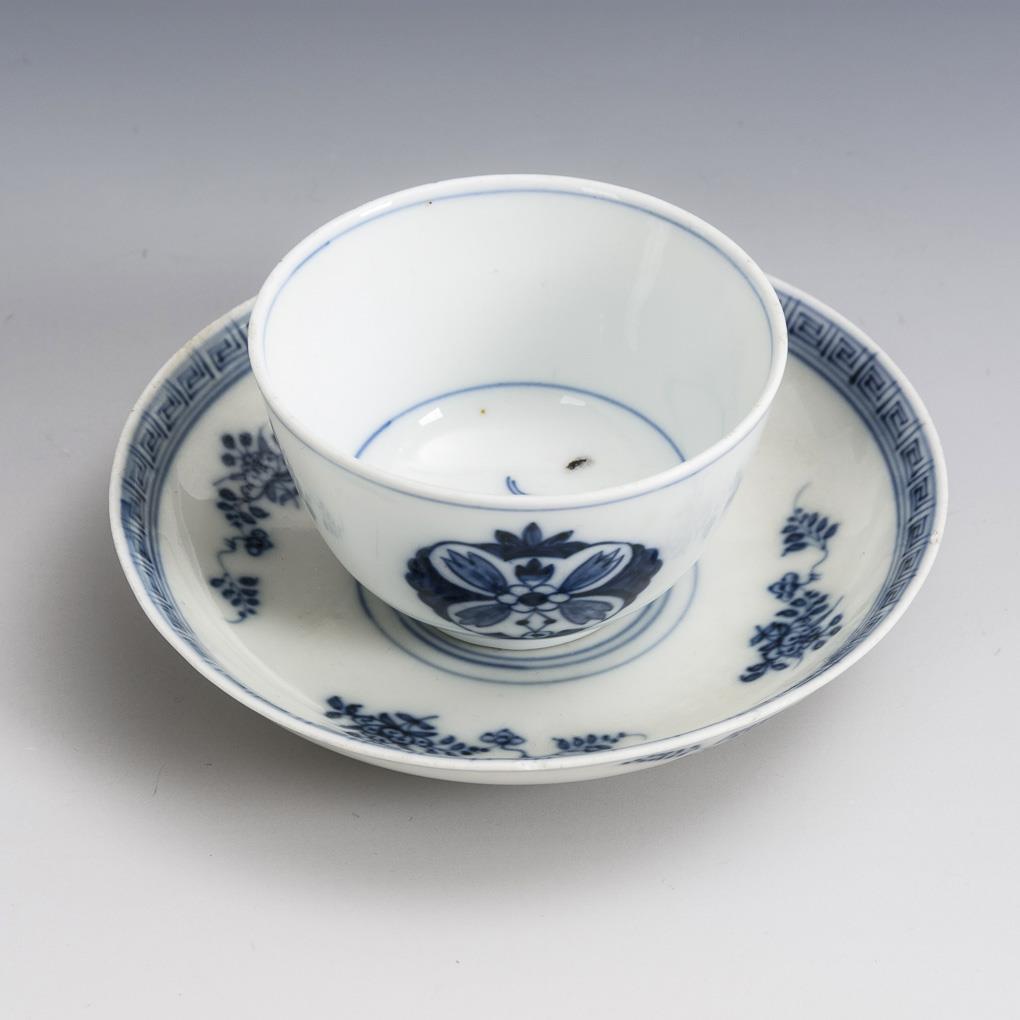 Unterglasurblaue, indianische Floralmalerei. H Koppchen 4,5 cm, Ø Untertasse 12 cm.