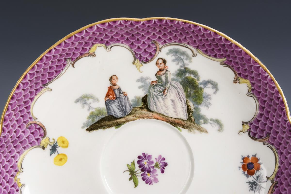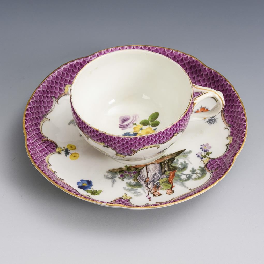 Bauchige Tasse mit gewundenem Henkel. Unter einer purpurfarbenen Schuppenbordüre Landschaftsinseln mit galanten Paaren. Minimaler Goldabrieb.