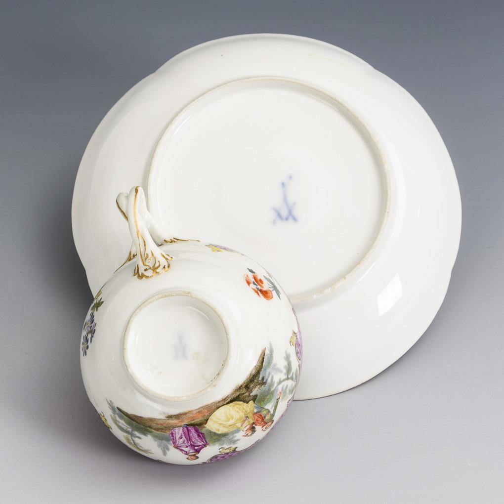 Polychrom bemalt, goldstaffiert. H Tasse 4,5 cm, Ø originale Untertasse 13,5 cm.