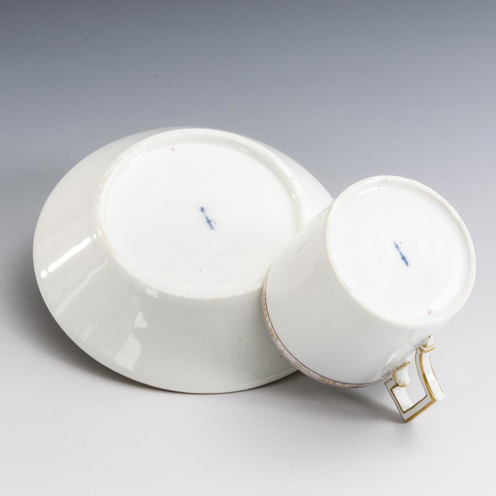 Polychrom bemalt, goldstaffiert. H Tasse 6 cm, Ø originale Untertasse 13 cm.