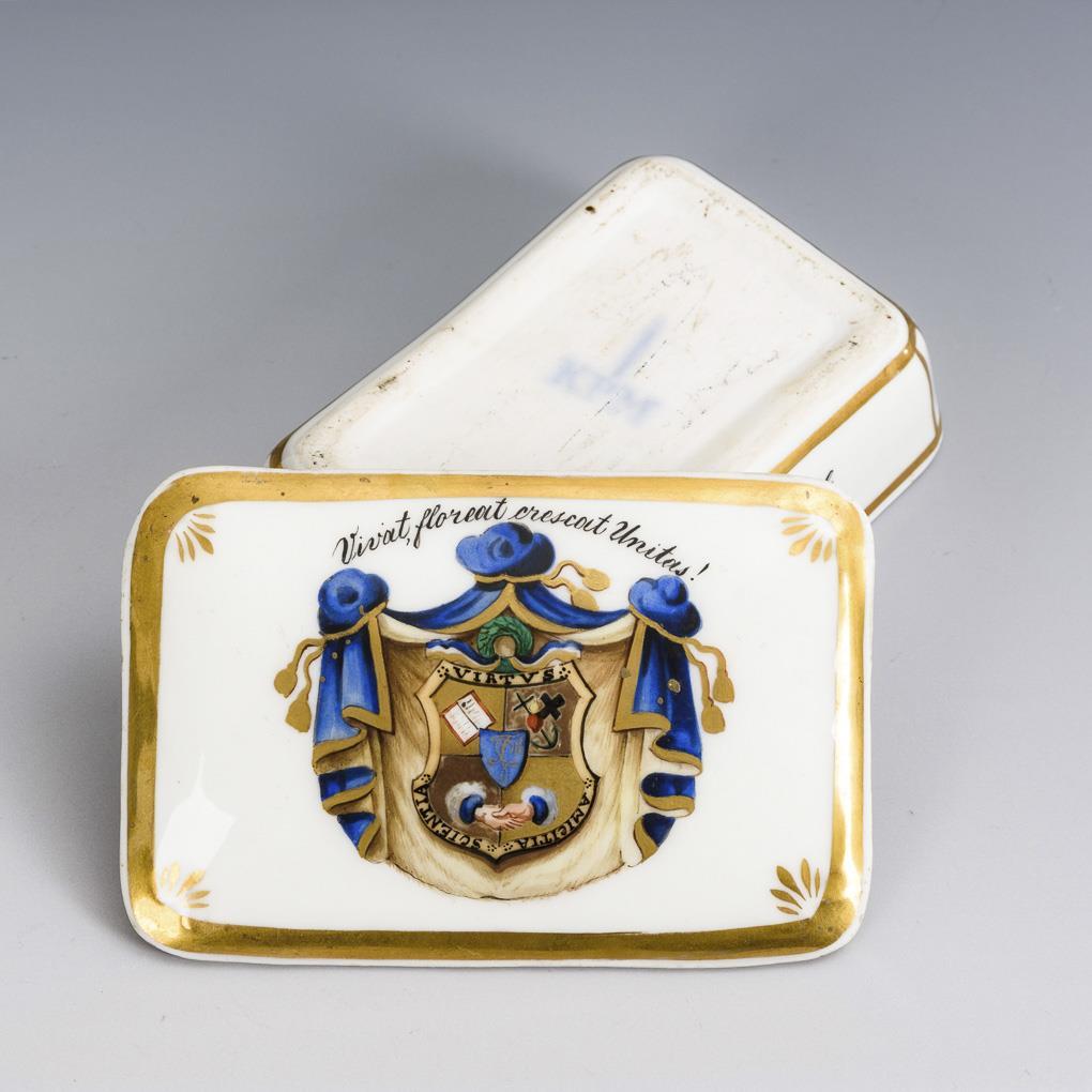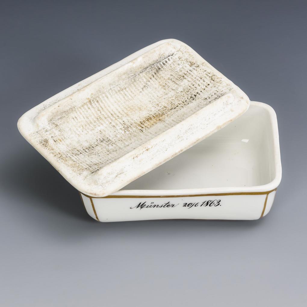 Rechteckige Dose mit Reibefläche im Deckelinneren. Auf dem Deckel ein studentisches Wappen (Unitas Salia/Bonn?) mit der Umschrift "Vivat floreat crescat Unitas!", auf dem Korpus die Widmung " C. Straeter s/m l. H. Liesen. / Münster 20/6 1863".