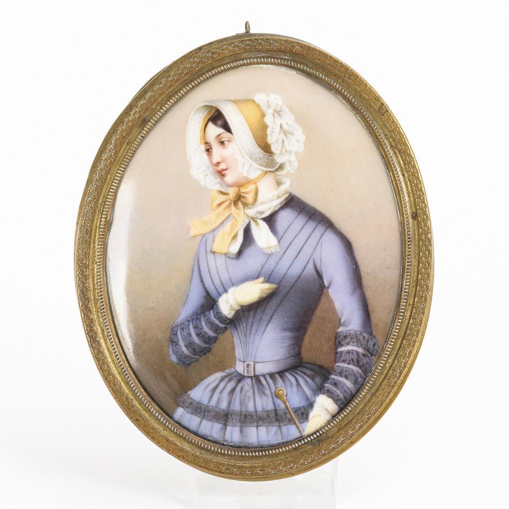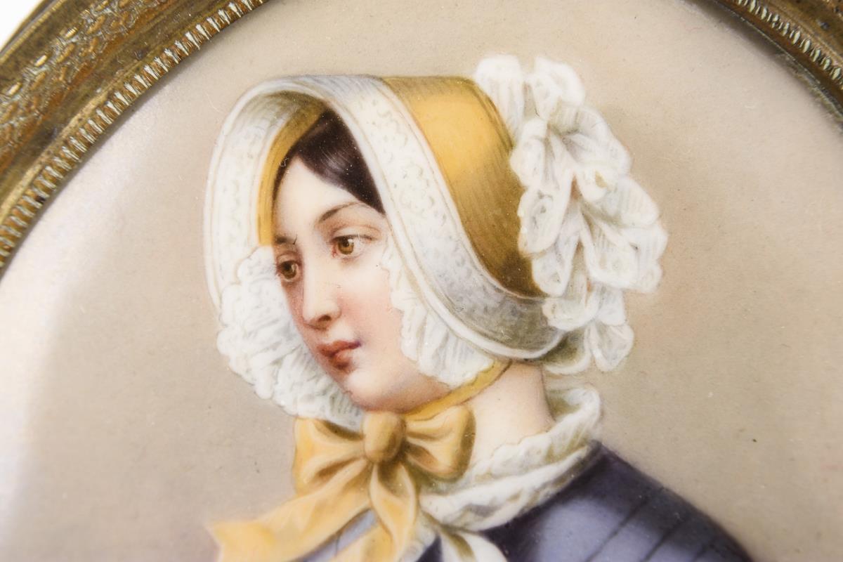Ovales Medaillon mit dem fein gemalte Porträt einer Biedermeier-Dame mit Schutenhut.
