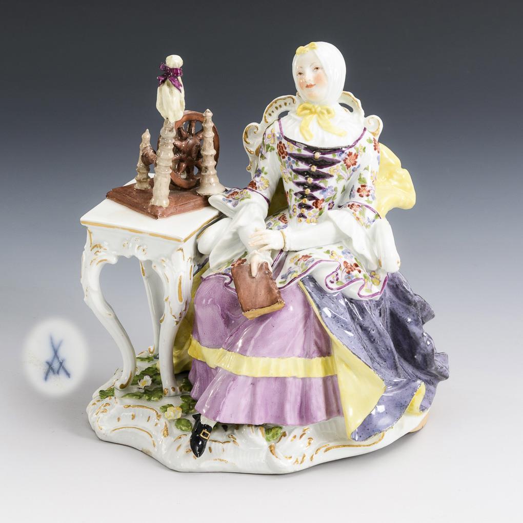 An einem Tisch mit Spinnrad sitzende Rokokodame mit Buch. Haarriss im Sockel, Füße, Buch und partiell Spinnrad restauriert.