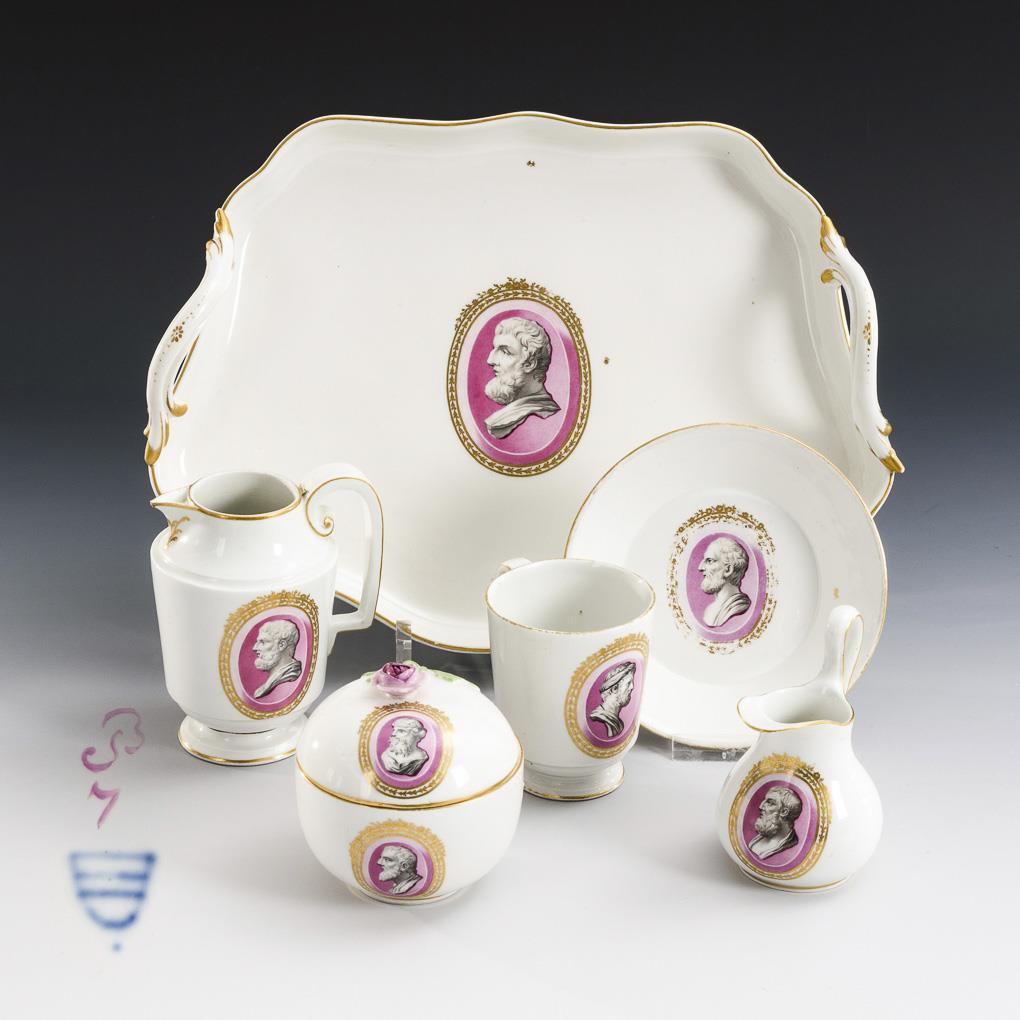 6 Teile. Mit grisaiilegemalten antiken Köpfen in rosafarbenen, floral goldgerahmten Medaillons. Mokkakännchen (ohne Deckel; H 11 cm), Milchkännchen (H 9,5 cm), Zuckerdose (H 8,5 cm), Tasse (H 8 cm), Untertasse (Ø 13 cm) und Tablett (L 31 cm). Partieller Goldabrieb, minimale Bestoßung an der Schneppe des Milchkännchens und am Zuckerdosenknauf.
