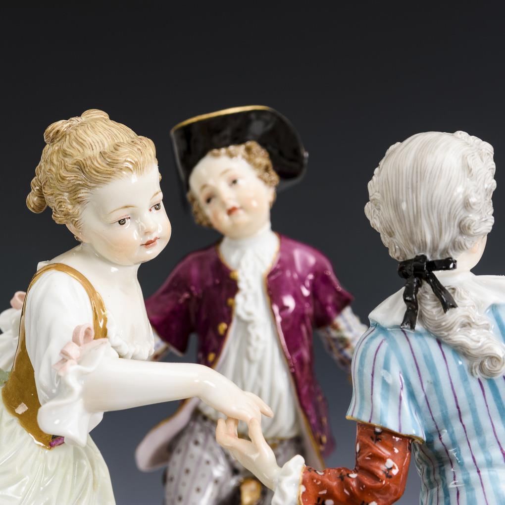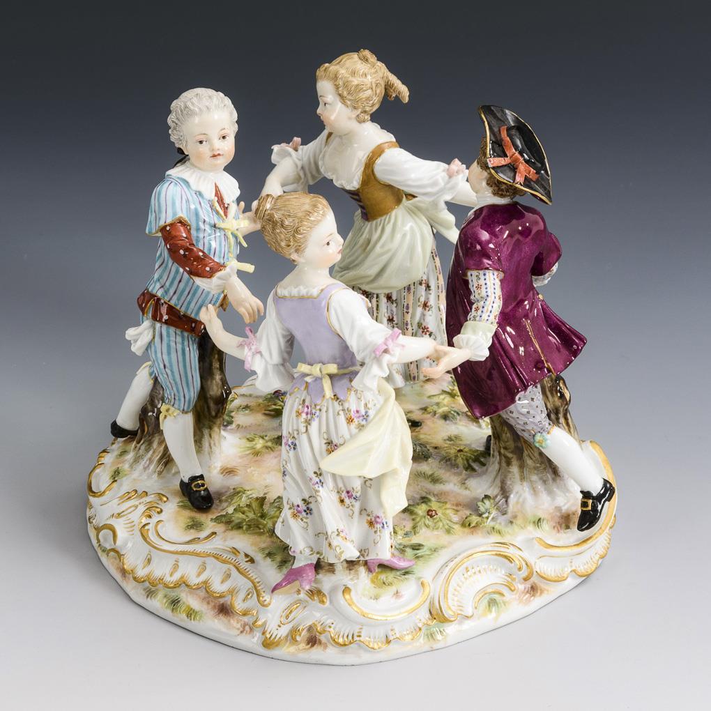 Vier, einen Reigen tanzende Gärtnerkinder auf einem Rocaille- und Natursockel. Partiell Schleifen und einige Blätter bestoßen, 1 Fuß restauriert.