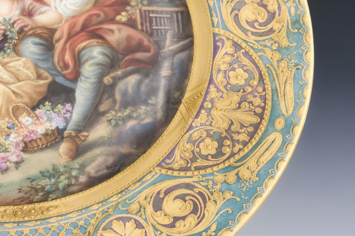 Teller mit russischgrünem und violettem, lüstriertem Teilfond auf der Fahne sowie reicher ornamentaler, teils reliefierter Goldmalerei. Im Spiegel die Darstellung eines Schäferpaares in einer Waldlandschaft, verso bezeichnet "Schäferstündchen". 1 Goldabplatzer.