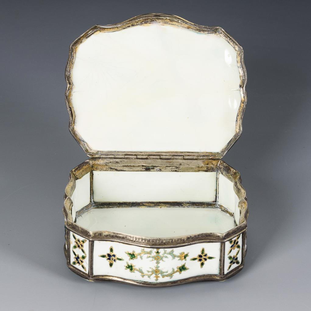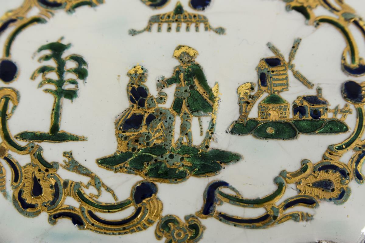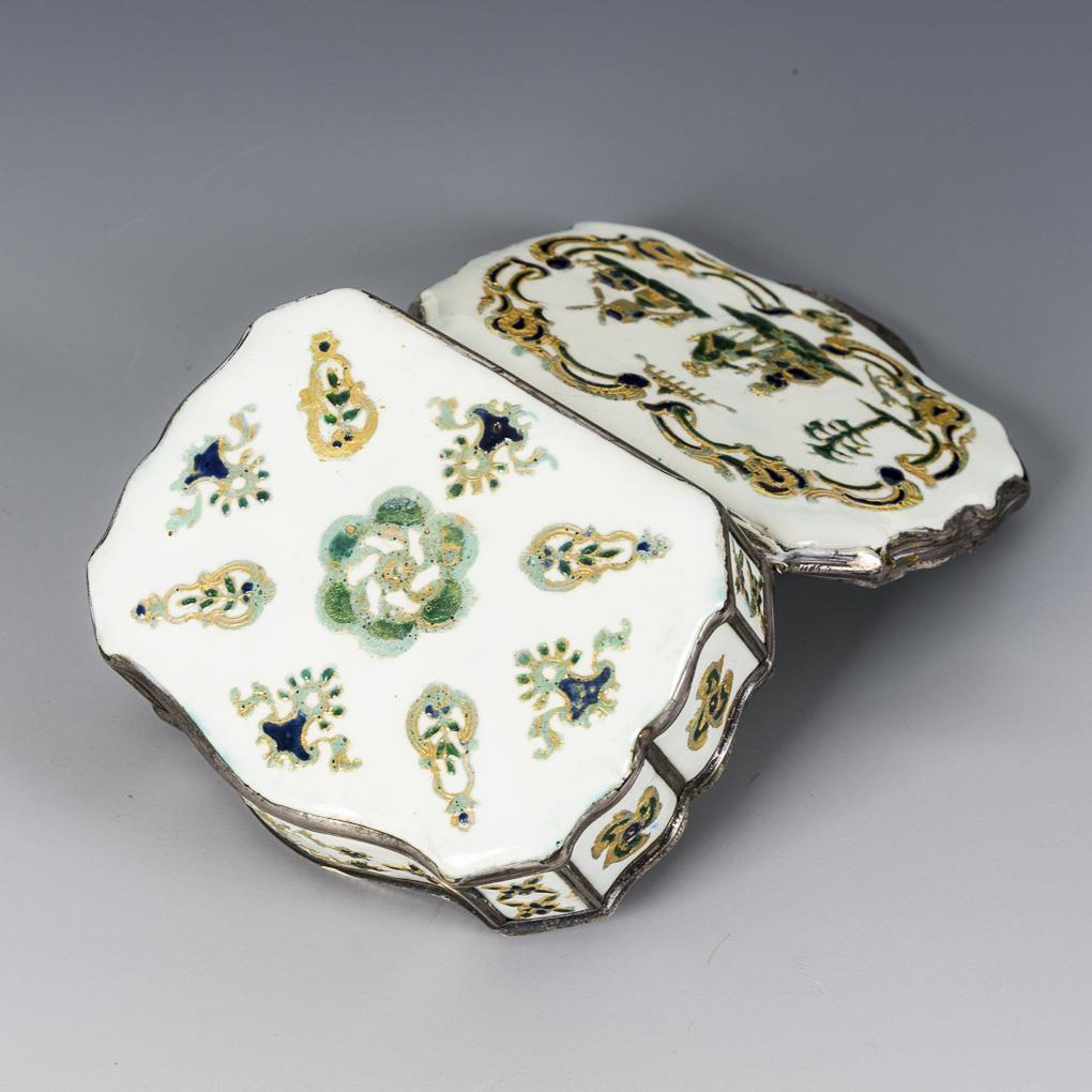 Geschweifter Korpus allseits und auf dem Boden mit Blumen verziert; auf dem Scharnierdeckel ein Paar zwischen Baum und Windmühle im Rocaillerahmen. Einige Alters-/Gebrauchsspuren.
