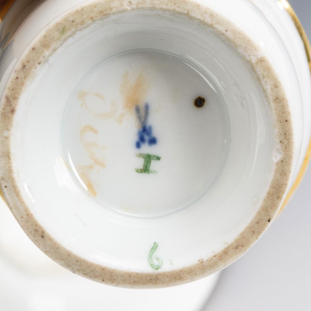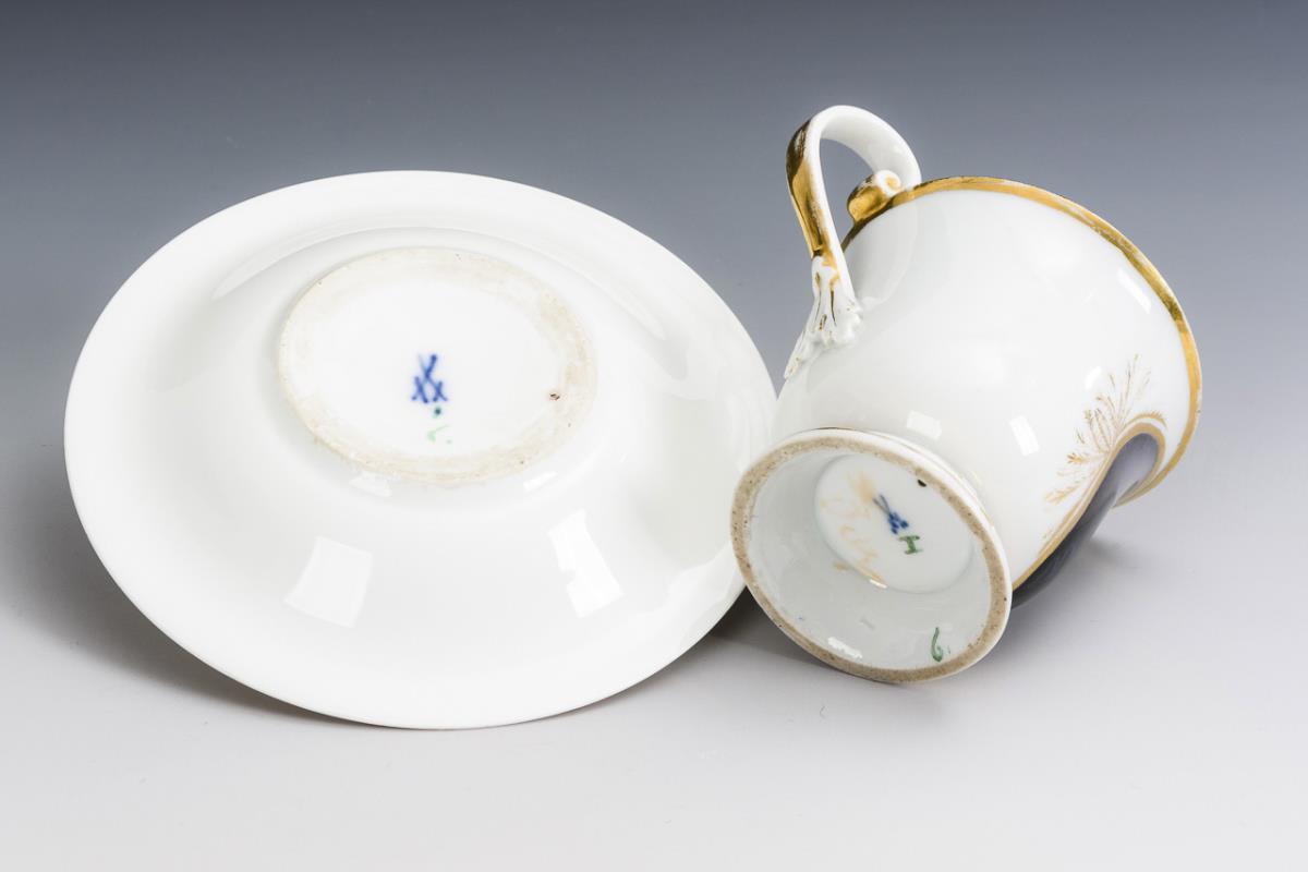 Polychrom bemalt, goldstaffiert. H Tasse 9,5 cm, Ø ergänzte Untertasse 14 cm.