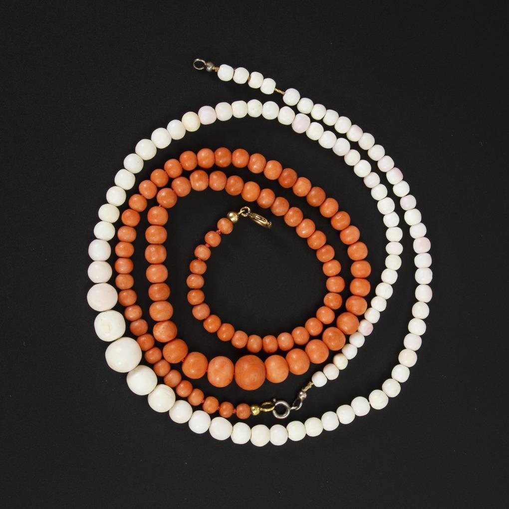 Schnürketten mit Korallenkugeln im Verlauf, an Metall-Ringfederschließen.