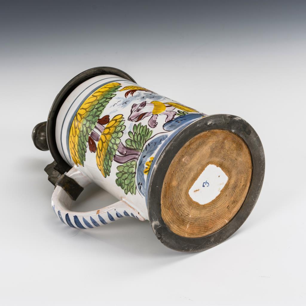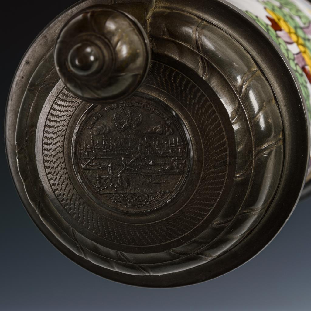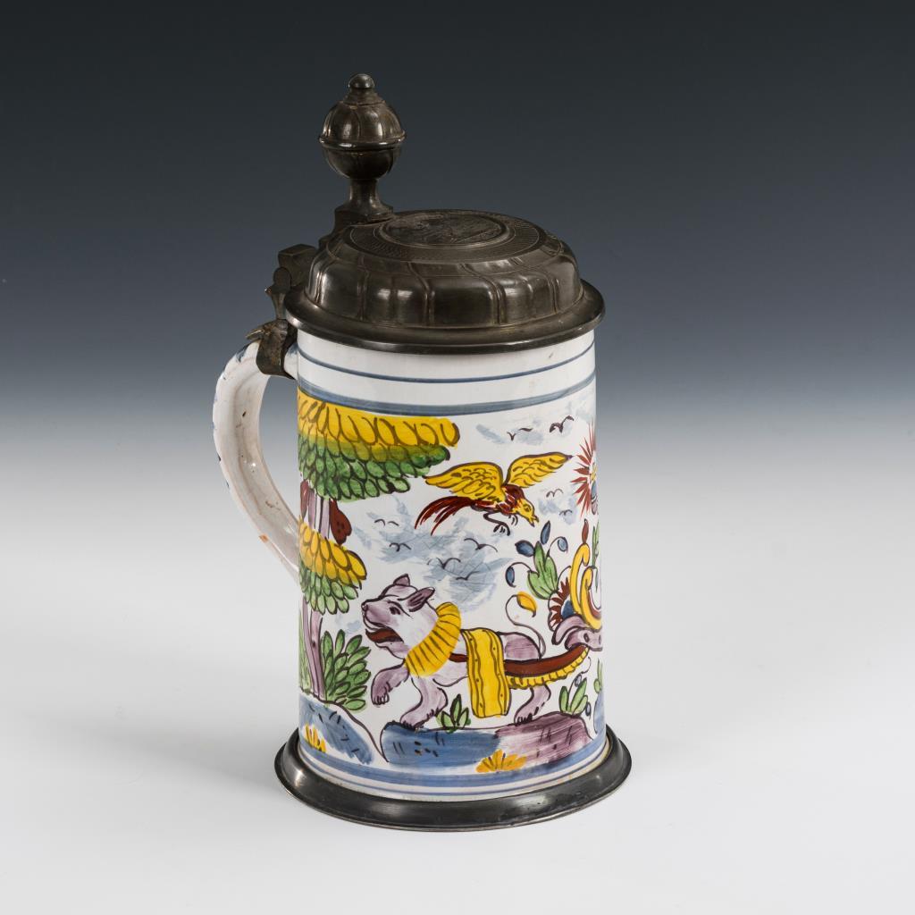 Zylinderkrug mit orientalisierendem Herrschaftsmotiv und Etagenbäumen, gestrichelter Bandhenkel. Profilierter und gepunzter Zinndeckel mit Reliefbild und Kugeldrücker, Zinnstandring. Leichte Randbestoßungen, Wandungshaarriss, Deckel gelockert.