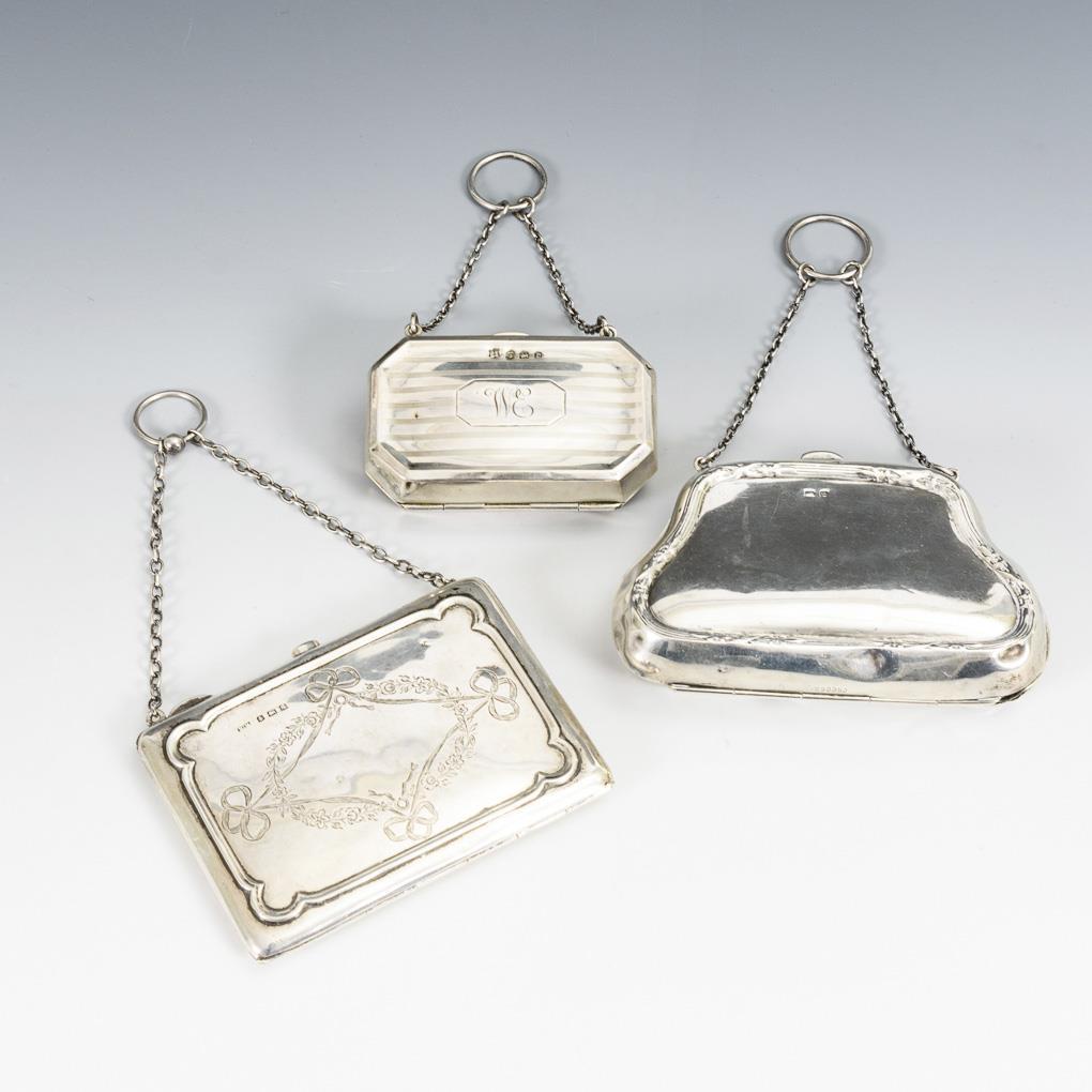 Elegante Täschchen an kurzer Kette, 1x mit Monogrammgravur "WE". Teils stark gedellt.