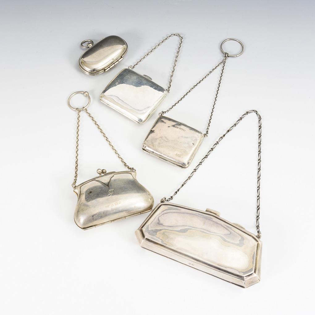 Verschiedene Täschchen und Geldbörsen, meist unverziert und an kurzer Kette, 1x jünger graviert "J. 14. 3. 1992". Gebrauchsspuren, Dellen.