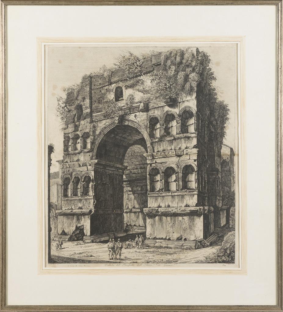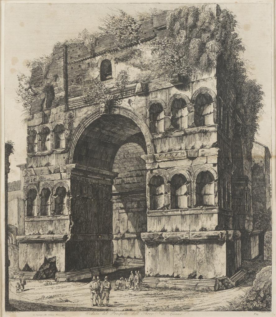Detailreiche Ansicht des Janusbogens in Rom, bezeichnet "Veduta del Prospetto dell' Arco di Giano"; Nr. 33 aus "Le Antichita Romane". Bugfalte, etwas stockfleckig.