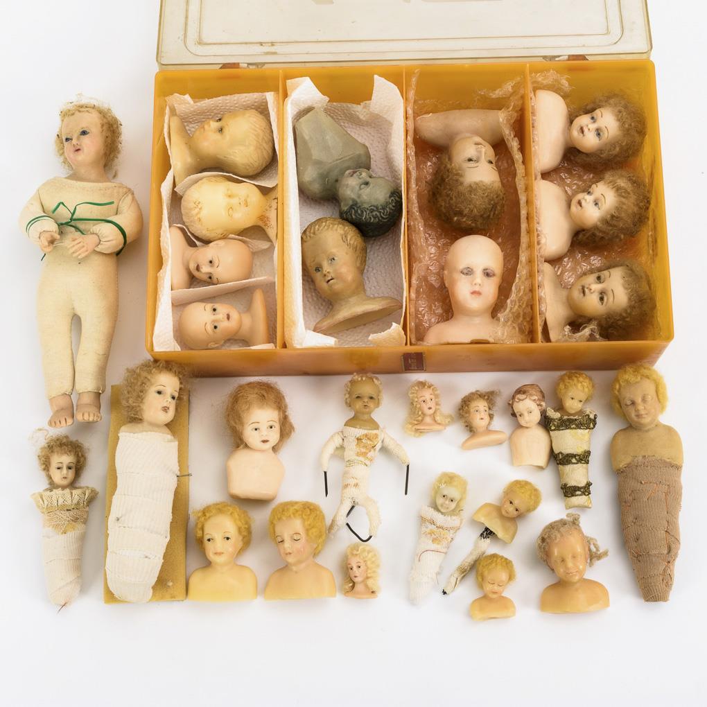 Großkonvolut 28 Wachspuppenköpfe, teils mit Körpern.