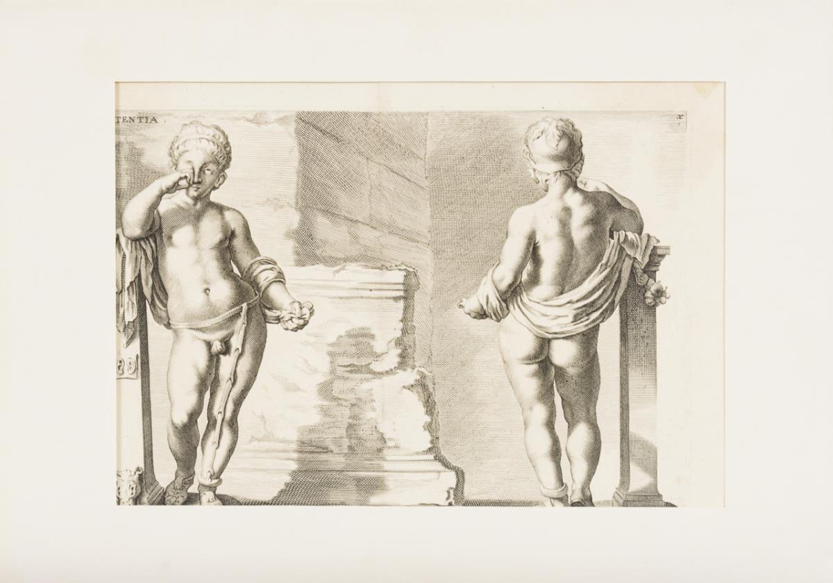 3 Tafeln mit antiken Skulpturen aus Joachim von Sandrarts "Teutsche Akademie", 1680 - "Meleager", Blatt: 41 x 24,5 cm, im Passepartout: 43 x 30,5 cm, "Poenitentia", 27,5 x 36,7 cm, im Passepartout: 30,5 x 43 cm und "Castor, Cybele, Fedra, Agrippina", Blatt: 41 x 25 cm, im Passepartout: 43 x 30,5 cm, je griffspurig, je verso mit Kleberückständen | 3 Tafeln aus Bernard Picards "Veux des ancient Romains", 1780, Blatt je: 42 x 25,5 cm, im Passepartout je: 43 x 30,5 cm, 1x stockfleckig | Tafel mit Darstellung mit Sandalen bekleideter Füße antiker römischer Statuen, wohl Johann Franck, Blatt: 41,3 x 24,3 cm, im Passepartout 43 x 30,5 cm, griffspurig.