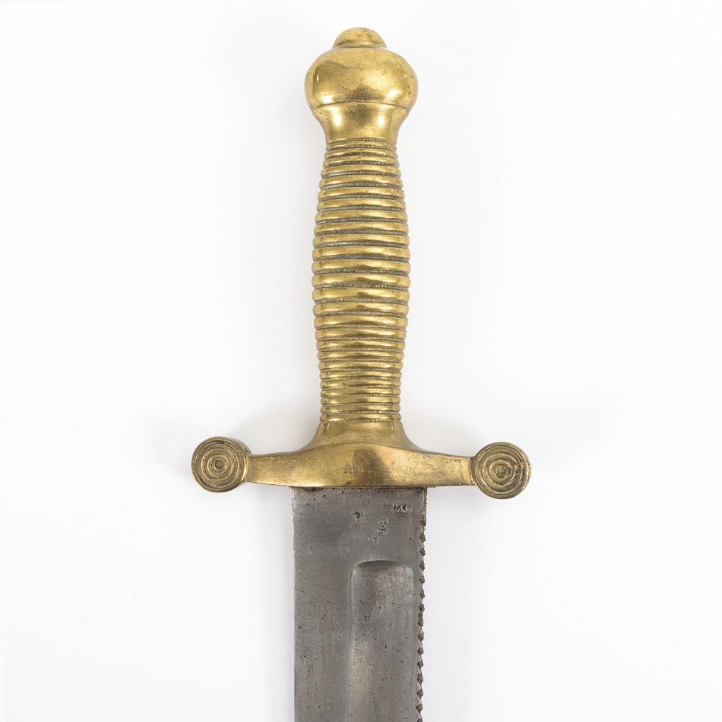 Nach französischem Vorbild. Zweischneidige Klinge mit breiter Kehlung, Säge auf zwei Drittel der Schneidfläche einer Seite. Stempelung auf Messinggriff "1864", sowie weitere Punzen auf Klinge und Scheide. Lederscheide mit Messingenden. Leichte Alters- und Gebrauchsspuren.