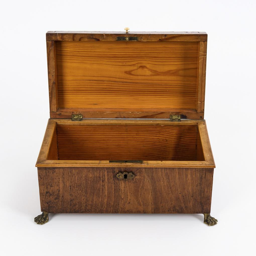 Quaderschatulle auf Tatzenfüßen sowie Stern-Marketerie auf dem Scharnierdeckel. Geringe Furnierschäden, einige Alters-/Gebrauchsspuren.