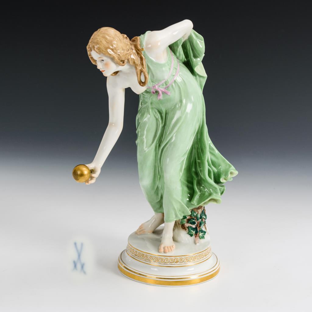 Bewegte Figur einer jungen, eine goldene Kugel werfenden Dame, auf profiliertem Rundsockel. 3 Efeublätter sowie Zeigefinger der rechten Hand restauriert.