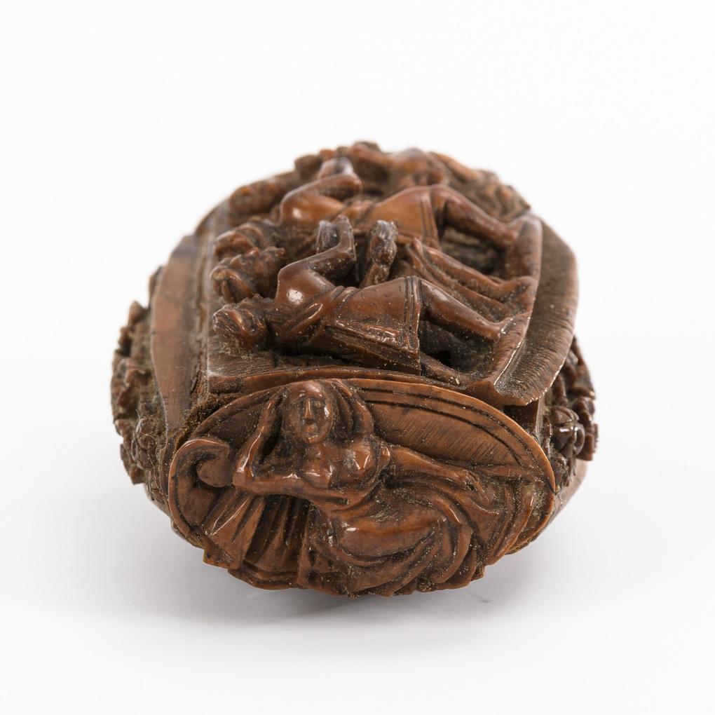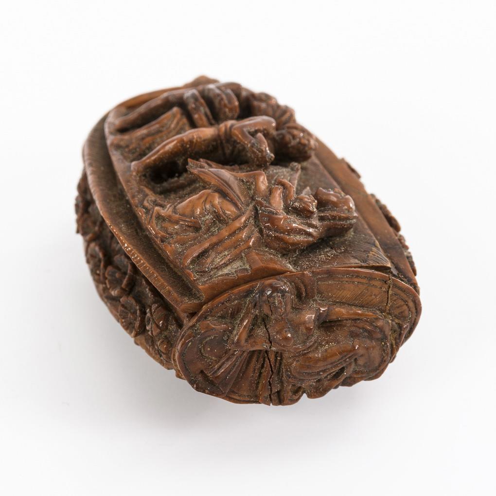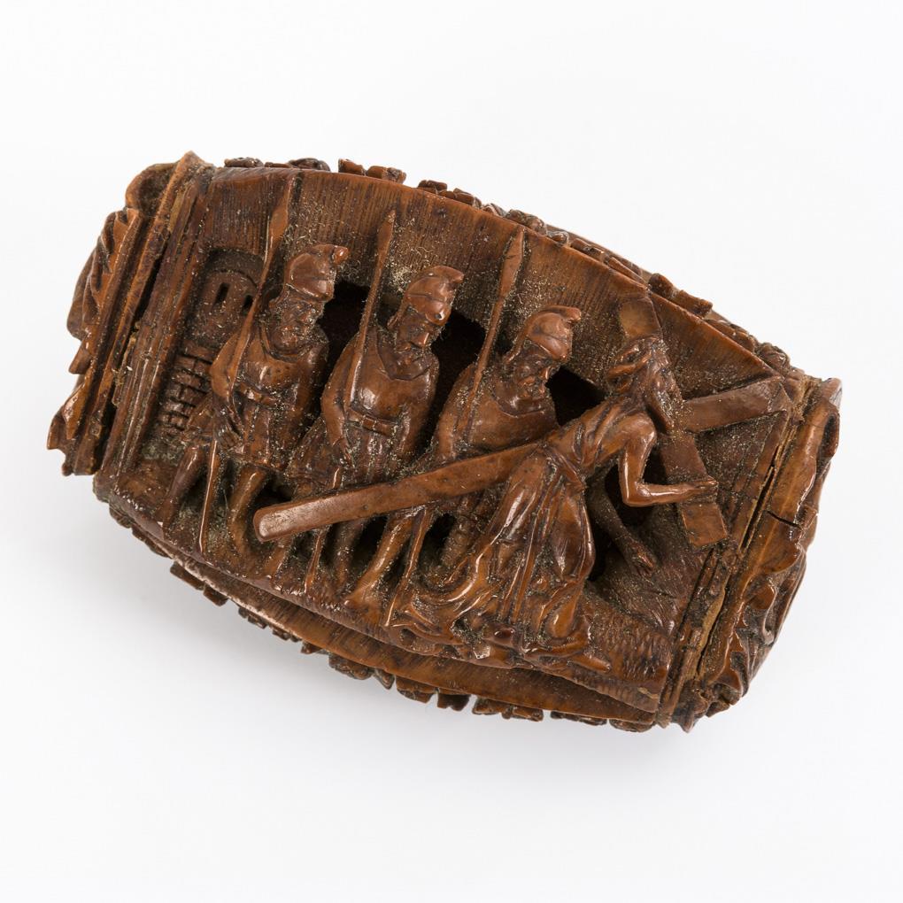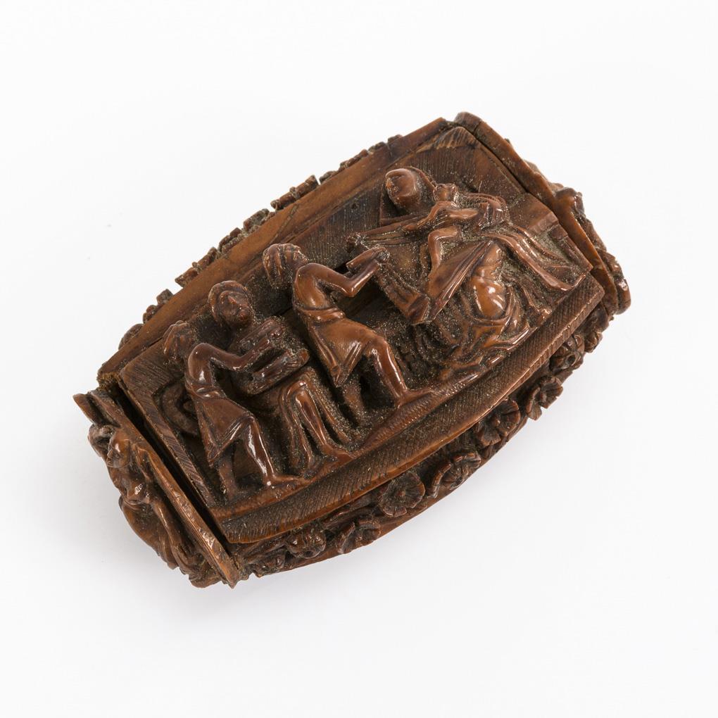 Tabatiere(?) mit À-Jour-Schnitzerei auf den Hauptseiten: Anbetung der Könige bzw. Kreuztragung. An den Stirnseiten je eine lagernde Frau; die Schmalseiten mit Blumen. Haarriss an einer Stirnseite, Binnendeckel eventuell alt erneuert.