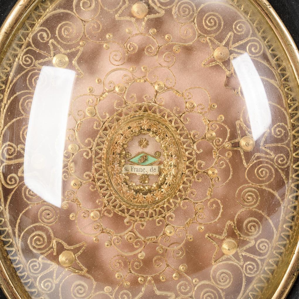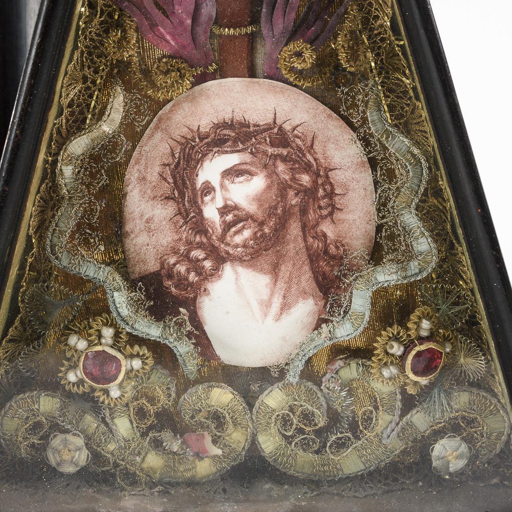 Agnus-Dei-Wachsplakette(?) von Clemens XII. (1652-1740). Altaraufsatz (Altarpyramide) mit gedrucktem Christusbildnis nach Guido Reni. Gewölbt verglaste Reliquie "S. Franc. de ..." in Papierarbeit. Kaum Fehlteile, geringe Alters-/Gebrauchsspuren.