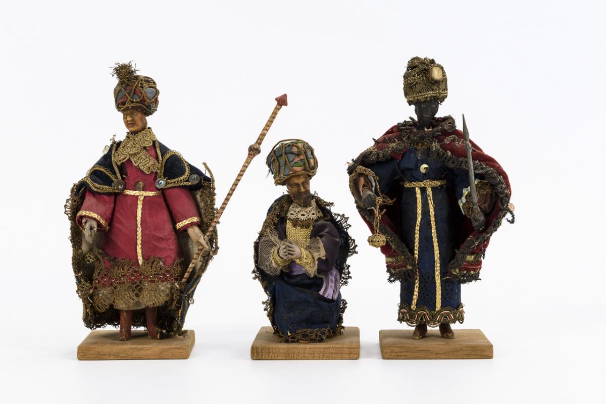 Prächtig gekleidete Weise aus dem Morgenland; einer kniend. 1 Kopf geklebt, teils stärkere Alters-/Gebrauchsspuren. Plinthen ergänzt.