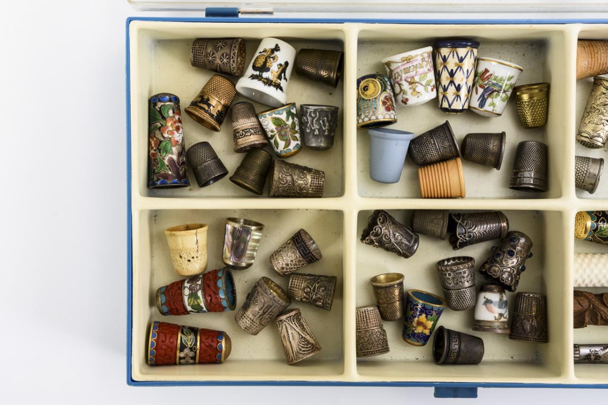 51 Fingerhüte, 3 Nadel- und 1 Garnbehälter.