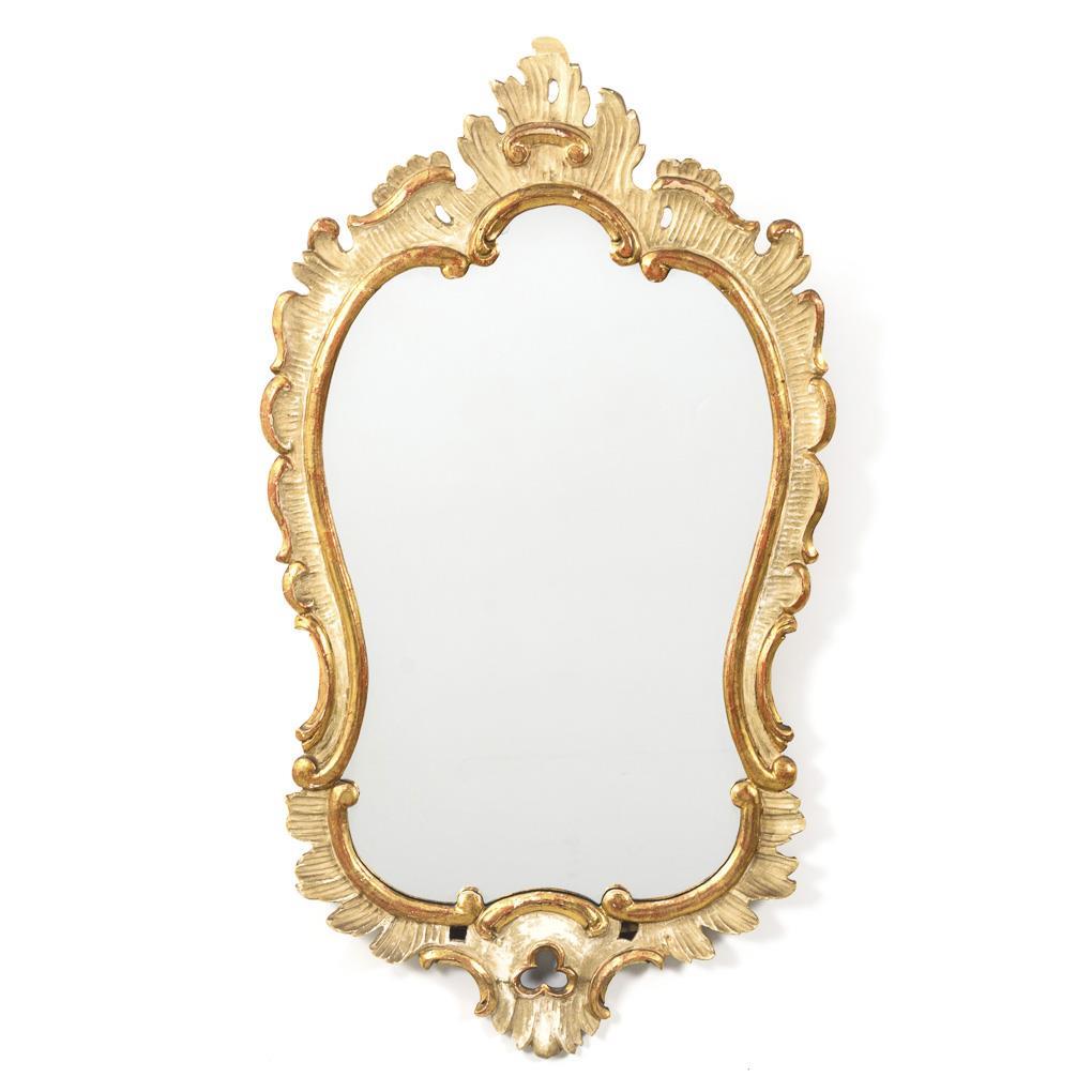 Geschweifter Rahmen mit Rocaillen und stilisierten Blättern. Kleine Fehlstelle, 1 Klebestelle, berieben, jünger ergänztes Spiegelglas und Rückwand.