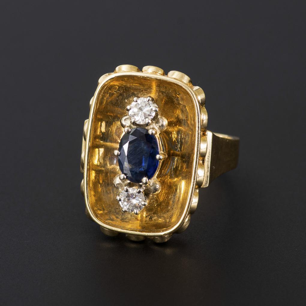 Gelbgold/Weißgold 585 gestempelt. Handarbeit 1950er Jahre. Saphir 0,99 ct. Brillanten gesamt 0,40 ct. Ringgröße 58. 12,2 g.