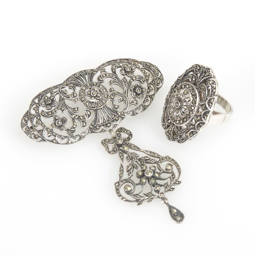 Große Ornamentbrosche mit Abhängung und Ring mit Markasitbesatz. Kugelhaken. Breite Schiene.